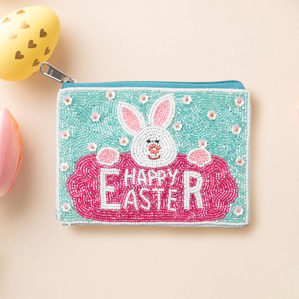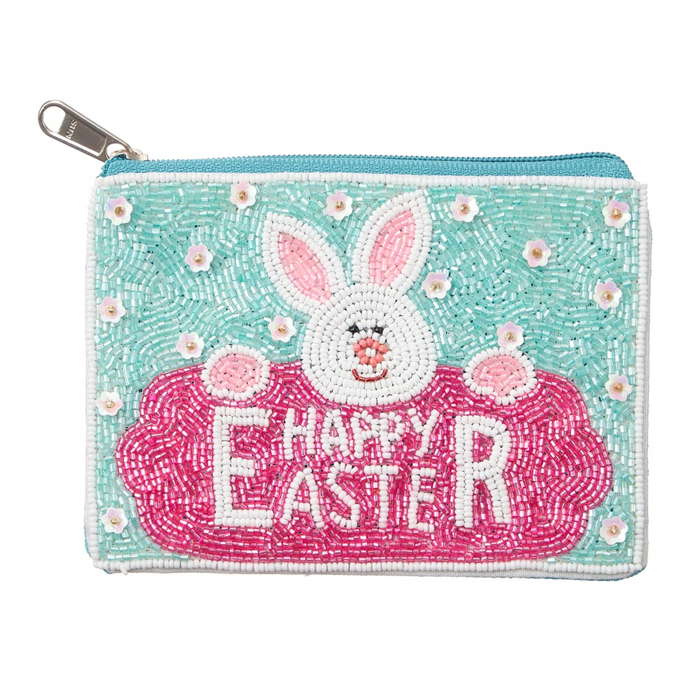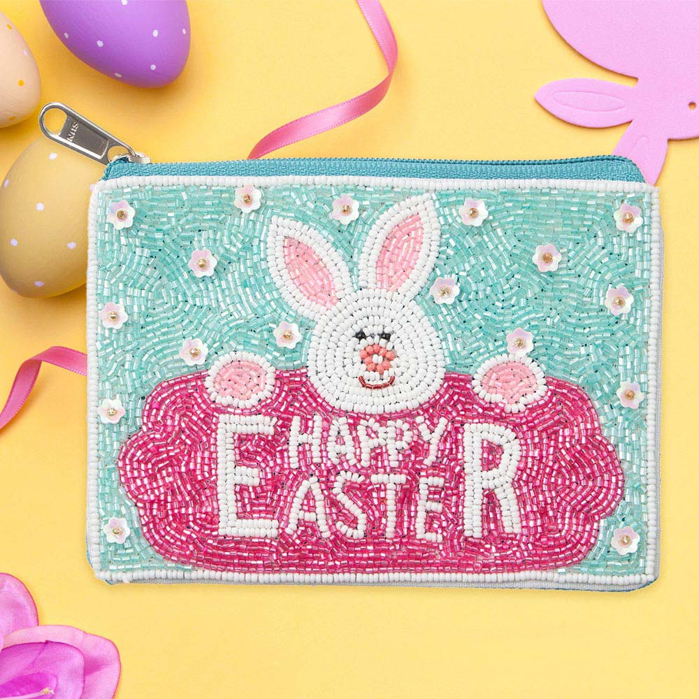 HAPPY EASTER Message Easter Bunny Seed Beaded Mini Pouch Bag