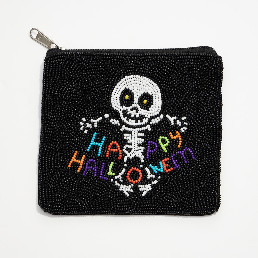 Details • Bag Size : 5.25" X 4.5" • No Inside Pocket • Beads on Front Only • Zipper Closure • Add spooky charm to your accessories with this beaded pouch featuring a cheerful skeleton and "Happy Halloween" design. Perfect for festive storage, gifting, or adding a playful seasonal accent. • Made In India