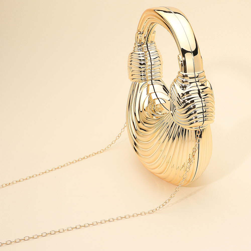 Details • Size : 10" X 10" X 3.25" • Top Handle Size : 5" L • Strap Size : 46" L / Detachable • Magnetic Closure • This sculpted fashion bag features a distinctive loop-handle silhouette with layered, curved ridges that create a bold, fluid shape. A sleek chained detail adds versatility, making it an expressive accessory that elevates evening outfits and modern, statement-driven looks.