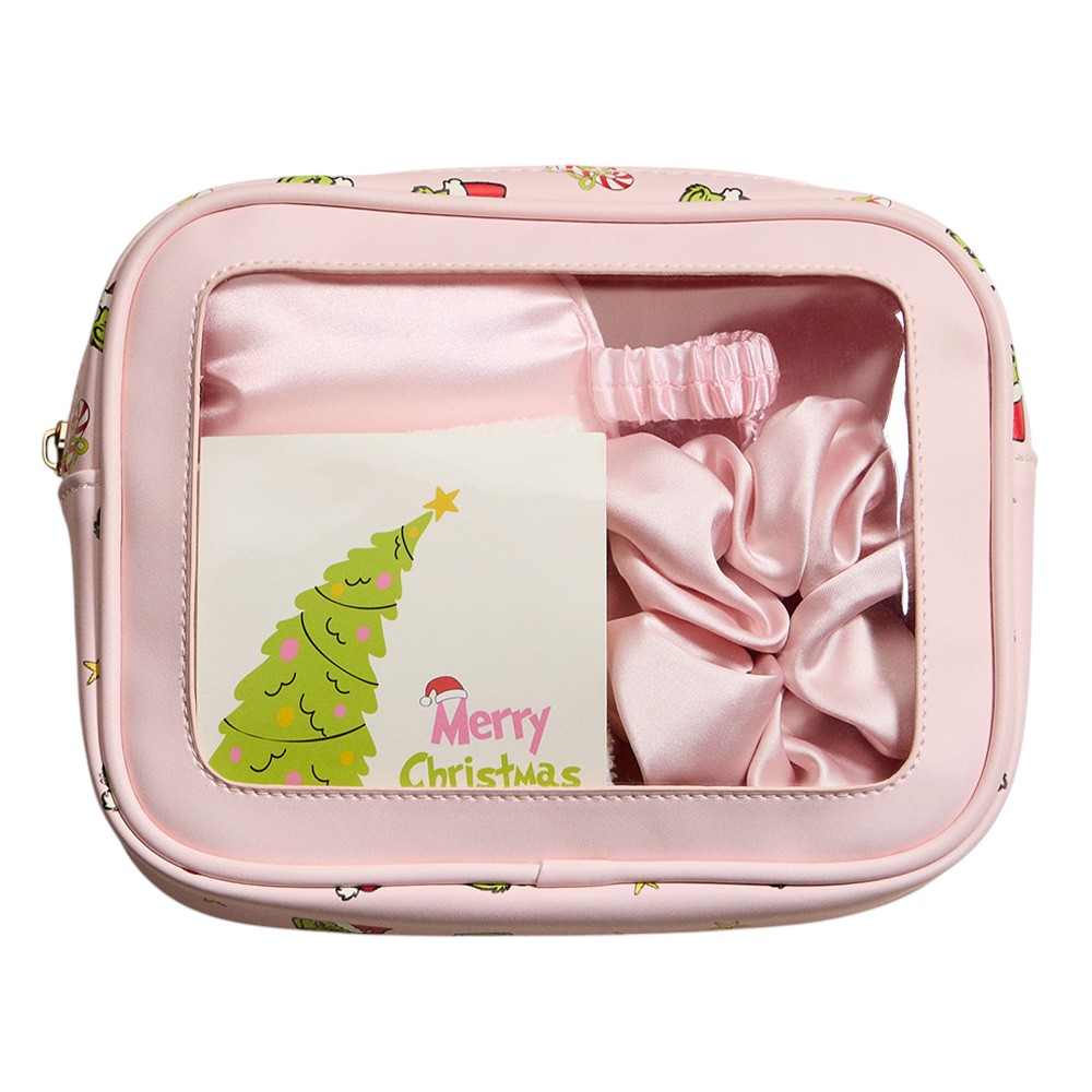 Details • Pouch Size : 7.5" X 6.5" X 1.5" • Zipper Closure • Delight in a festive Christmas gift set featuring a clear cosmetic bag with holiday accents, matching scrunchie, cozy socks, satin eye mask and a card. A perfect holiday surprise for pampering and self-care.