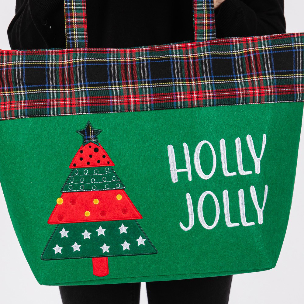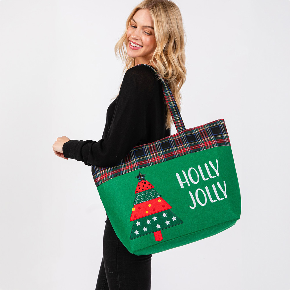 Details • Size : 19" X 13" X 6" • Zipper Closure • Material: 100% Polyester • Celebrate the season with this “HOLLY JOLLY” tote bag featuring a cheerful Christmas tree design and plaid accents. Spacious and fun, it’s ideal for shopping, gifting, or carrying holiday essentials in festive style. A perfect companion for seasonal cheer.