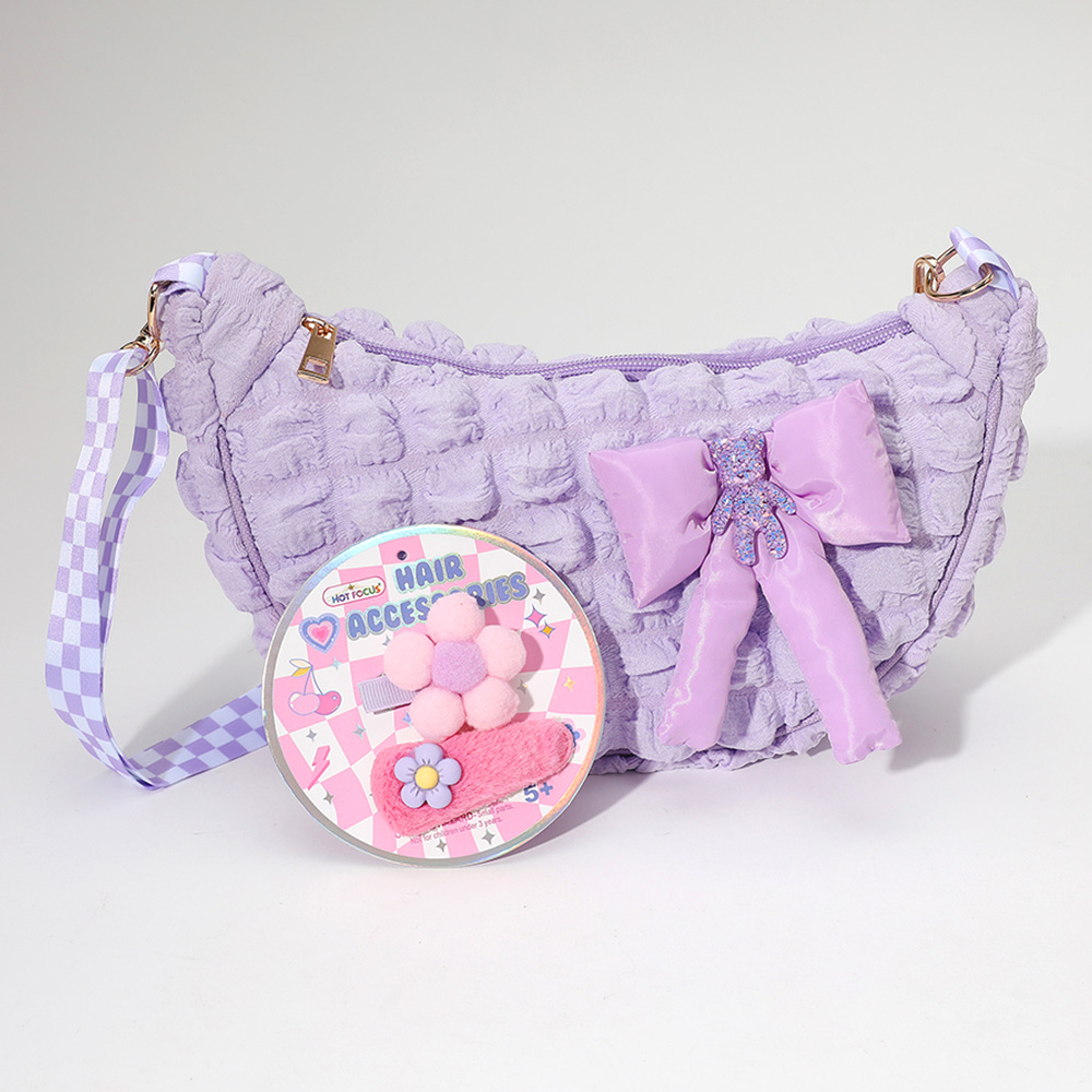 • Textured shoulder bag with oversized bow detail and matching adjustable strap. Comes with a coordinating hair accessories set including clips and ties. Perfect for gifting, parties, or everyday dress-up fun.