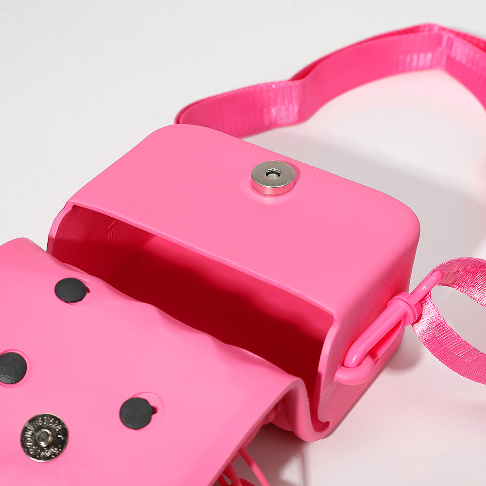 Details • Size : 5" X 3.75" X 2.75" • Strap Size : 29" L / Adjustable, Detachable • Charm Size : 7.5" L, 1.6" X 2" • Magnetic Closure • 1 Eva Hole Bag and 5 Decoration Charms Included