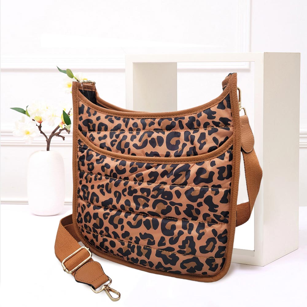Leopard Patterned Quilted Shiny Puffer Crossbody Bag