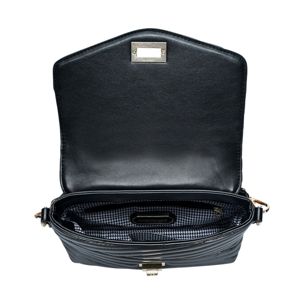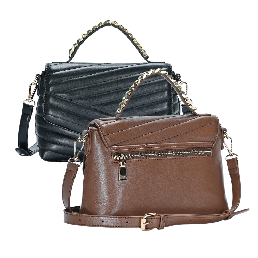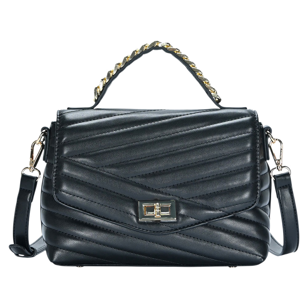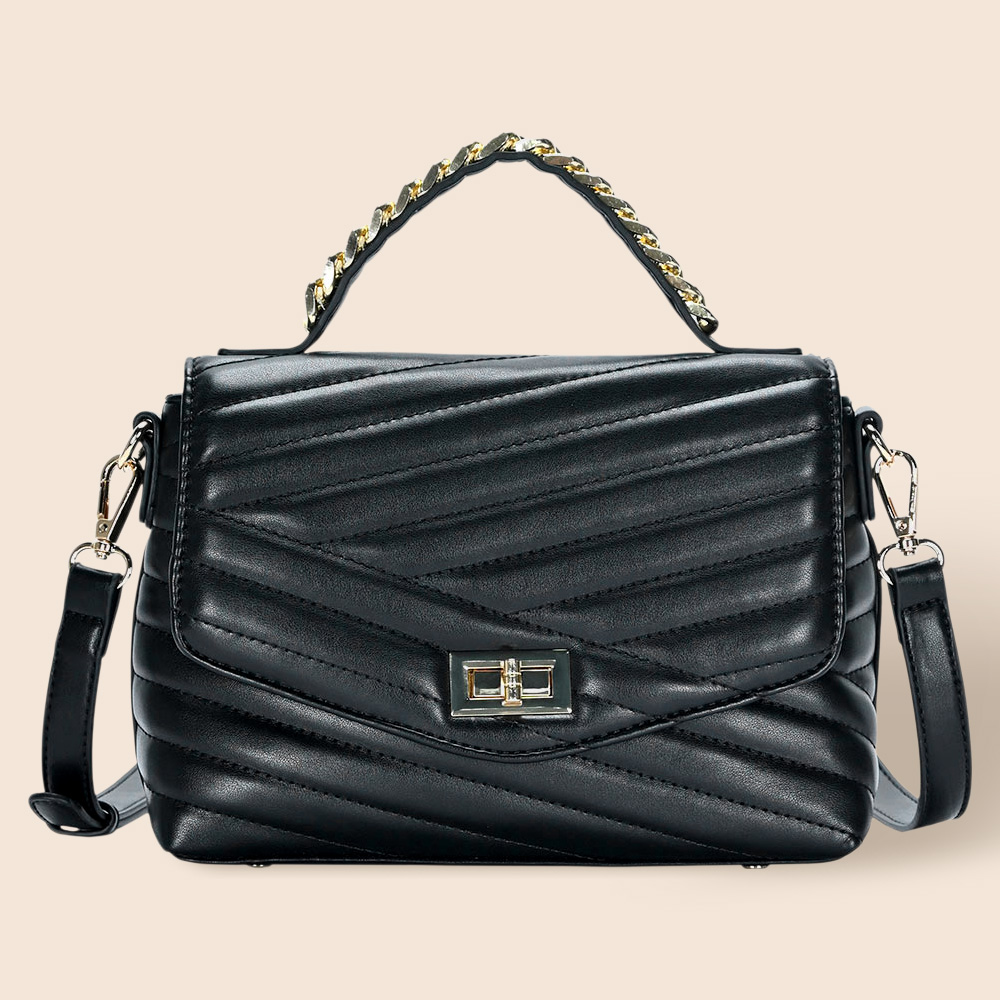 Details • Bag Size : 10" X 3.75" X 7" • Top Handle Size : 2.5" L • Strap Size : Adjustable, Detachable • Shell : 100% PU • Lining : 100% Polyester • One Inside Zipper Pocket • One Inside Slip Pocket • One Back Zipper Pocket • Turn Lock Closure • Elegant quilted handbag with turn-lock closure, top handle, and detachable shoulder strap. Perfect for everyday use or elevating your evening look.