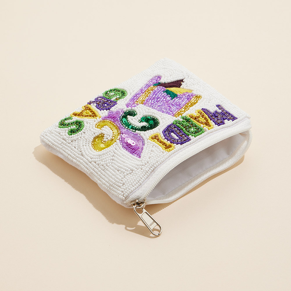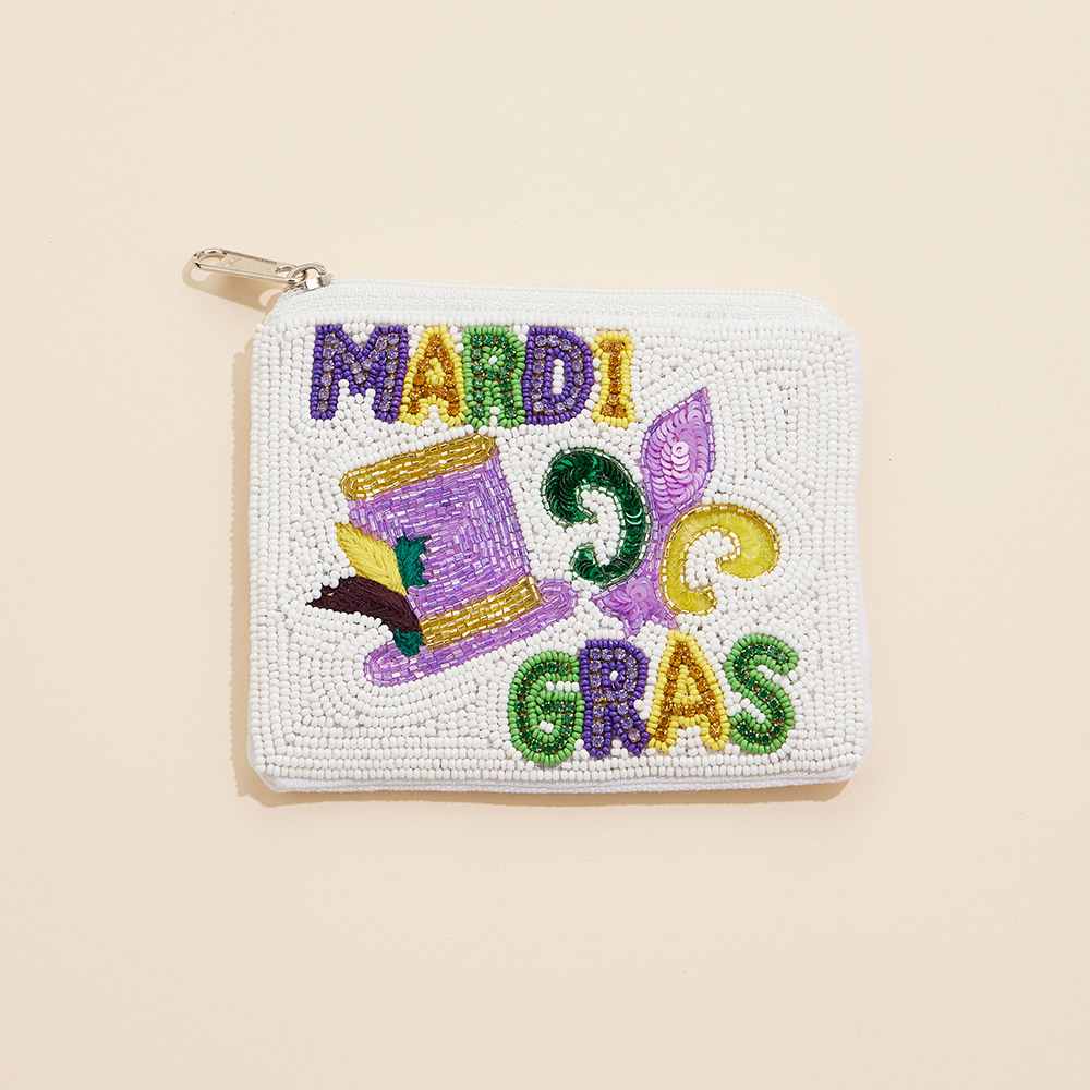 Mardi Gras Message Fleur de Lis Hat Stone Seed Beaded Mini Pouch Bag