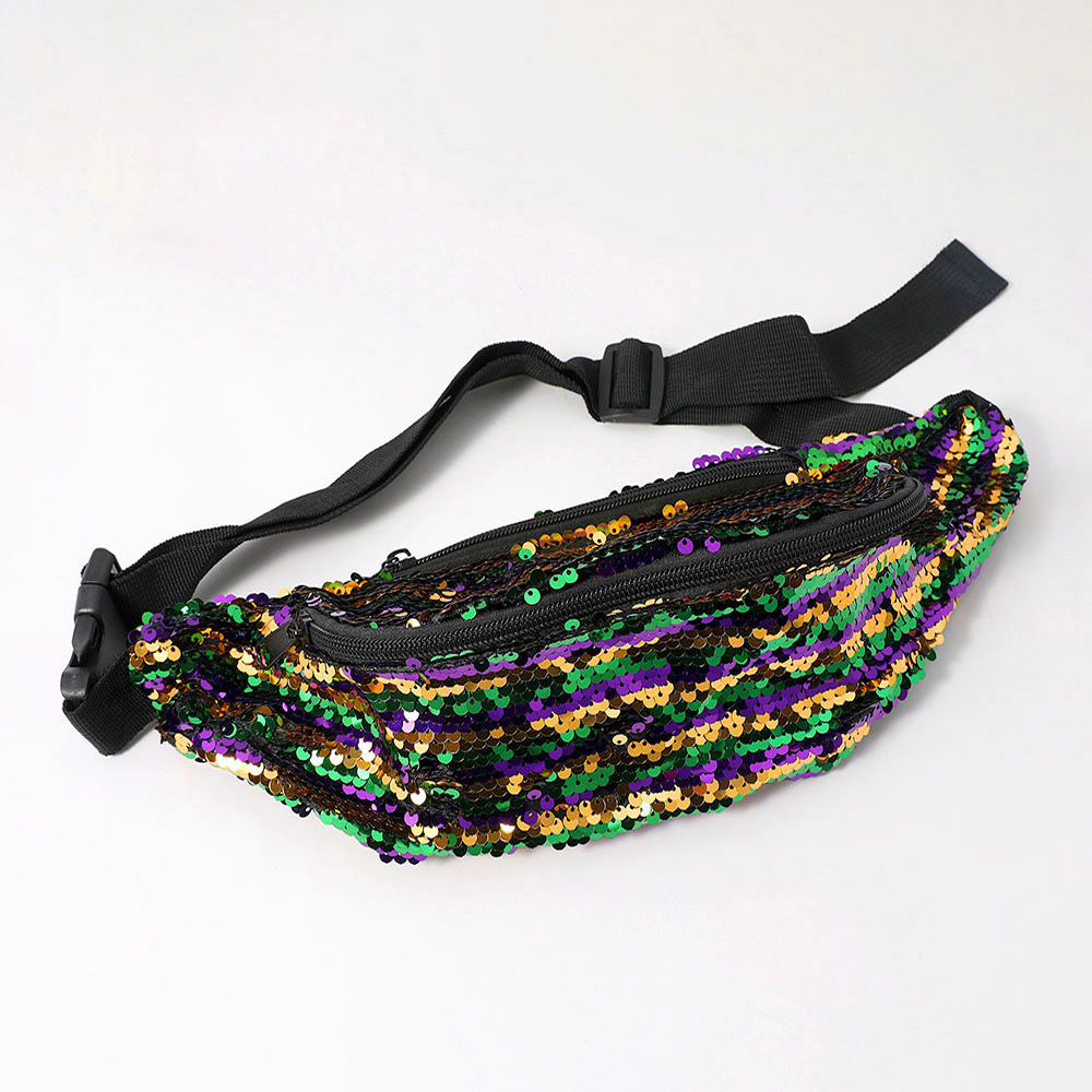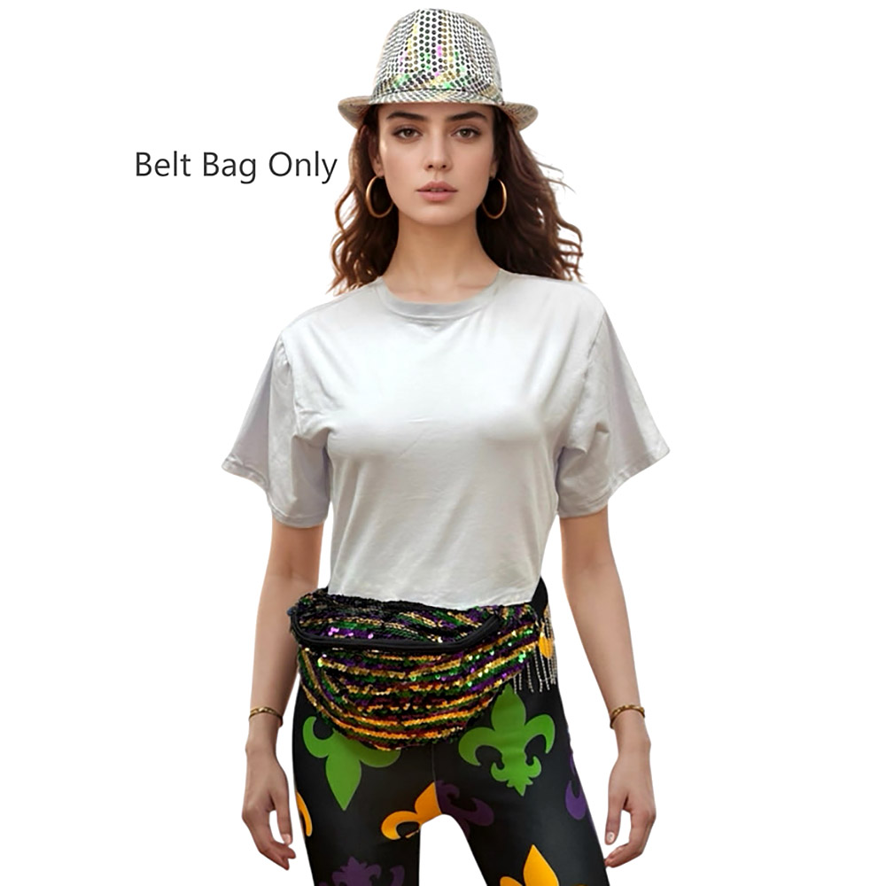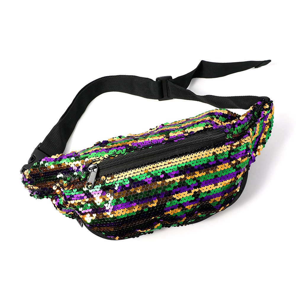 • Festive sequin Mardi Gras belt bag with zip closure and adjustable strap. Perfect for parades, concerts, and hands-free party fun.