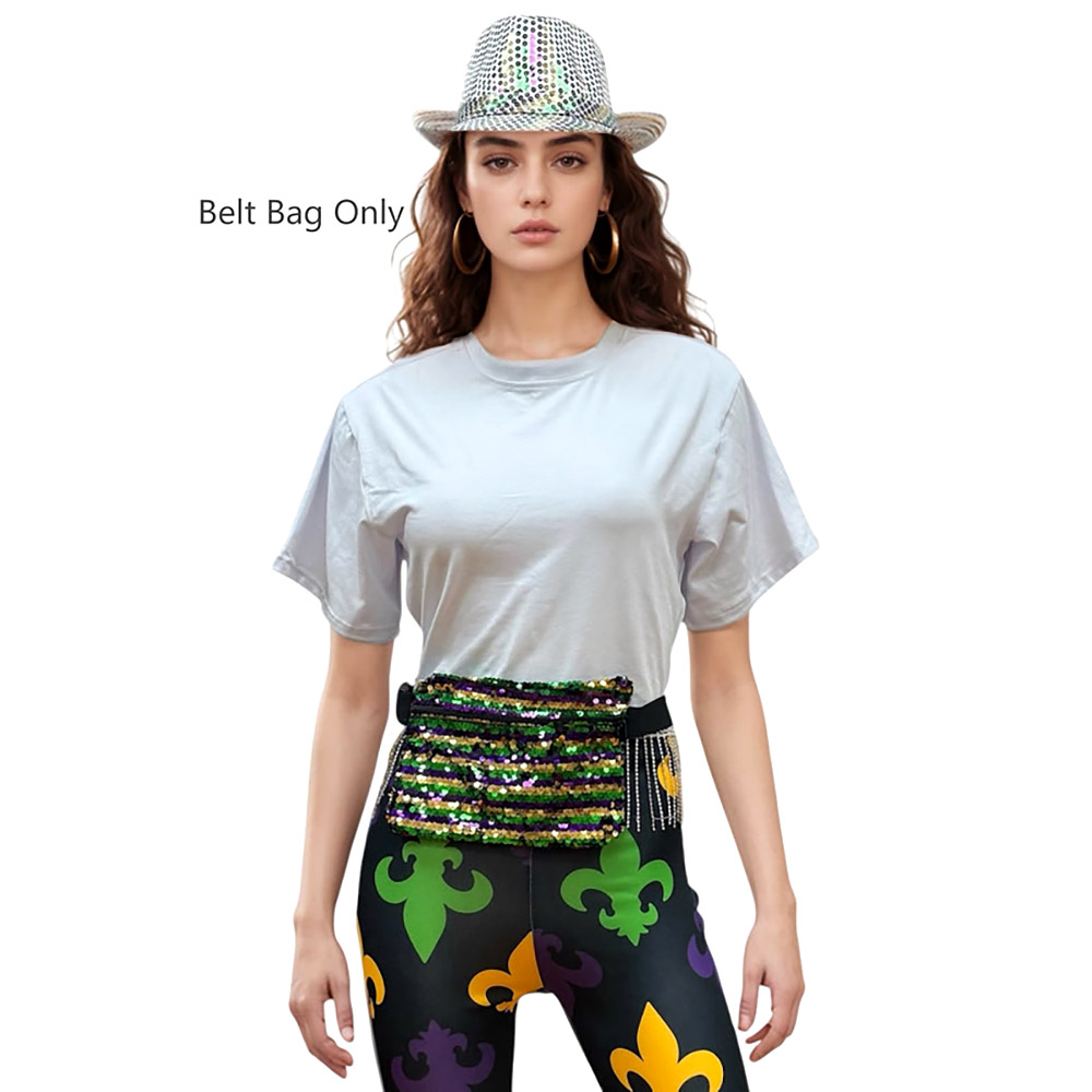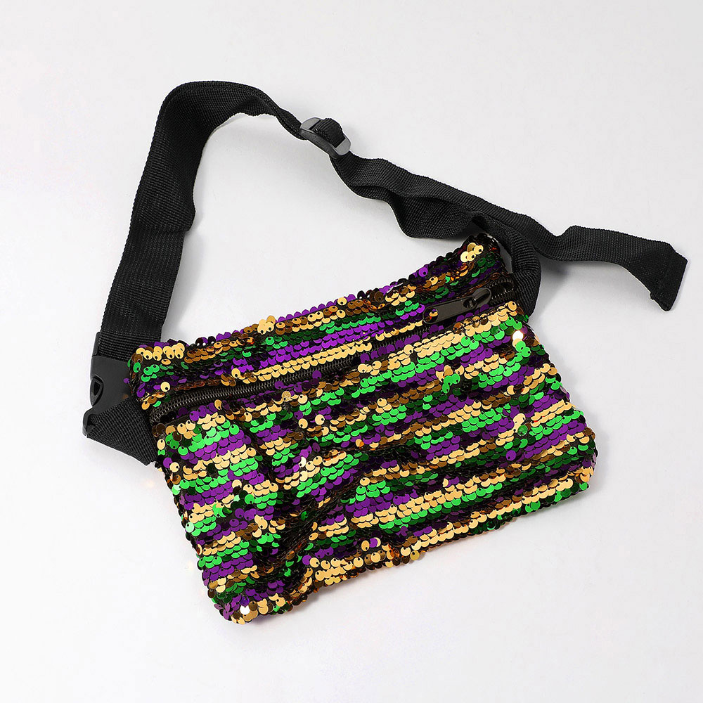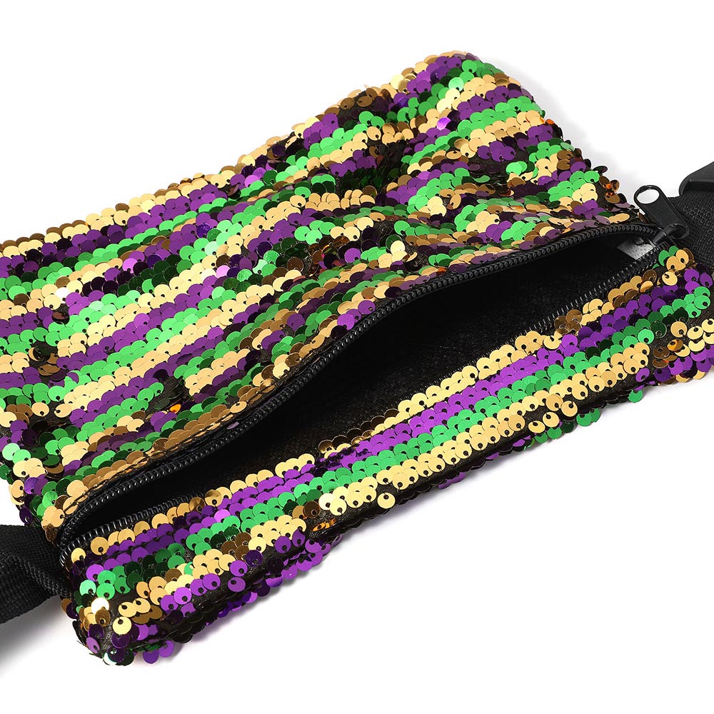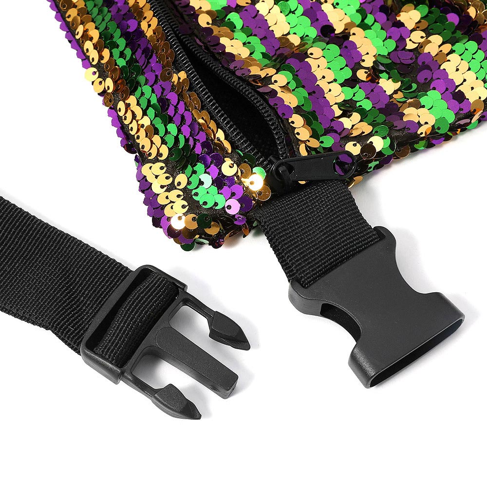 • Sequin Mardi Gras fanny pack with adjustable strap and zip closure. Eye-catching, hands-free style ideal for festivals, parades, and party nights.