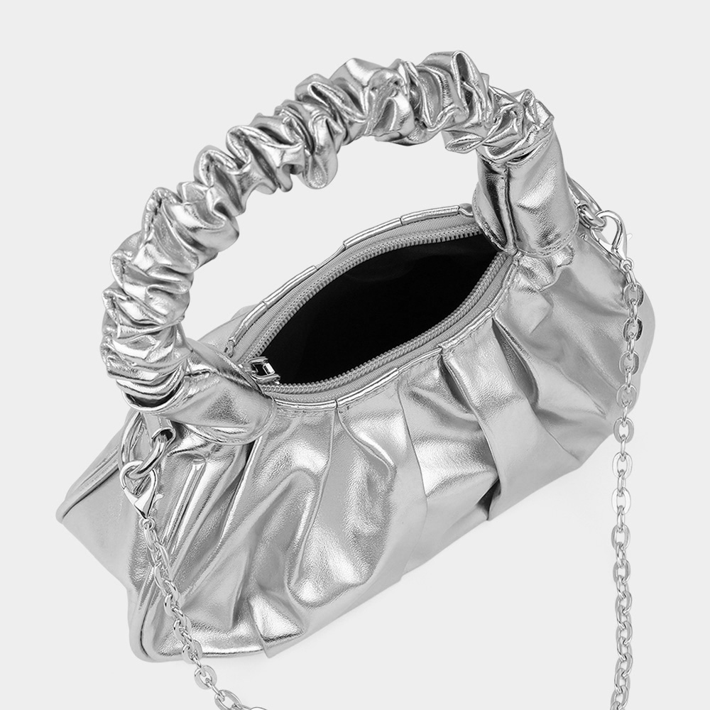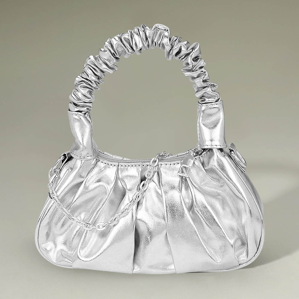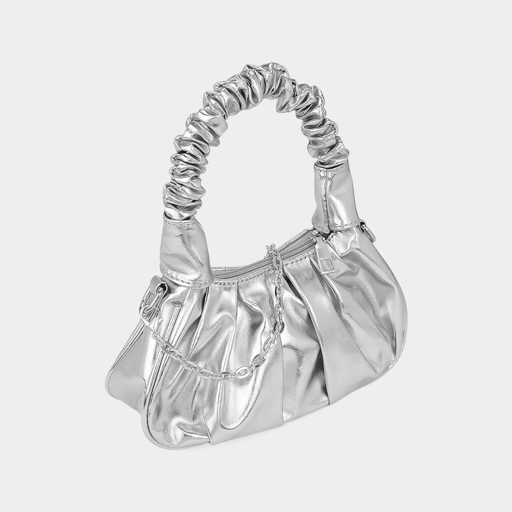 Details • Size : 8.25" X 4.75" X 2.75" • Top Handle Size : 3.25" L • Strap Size : 50" L / Detachable • Zipper Closure • Elevate any outfit with this chic ruched handbag featuring a gathered handle and chain detail. Its modern silhouette and versatile design make it perfect for day-to-night wear, adding effortless style and sophistication to your look.