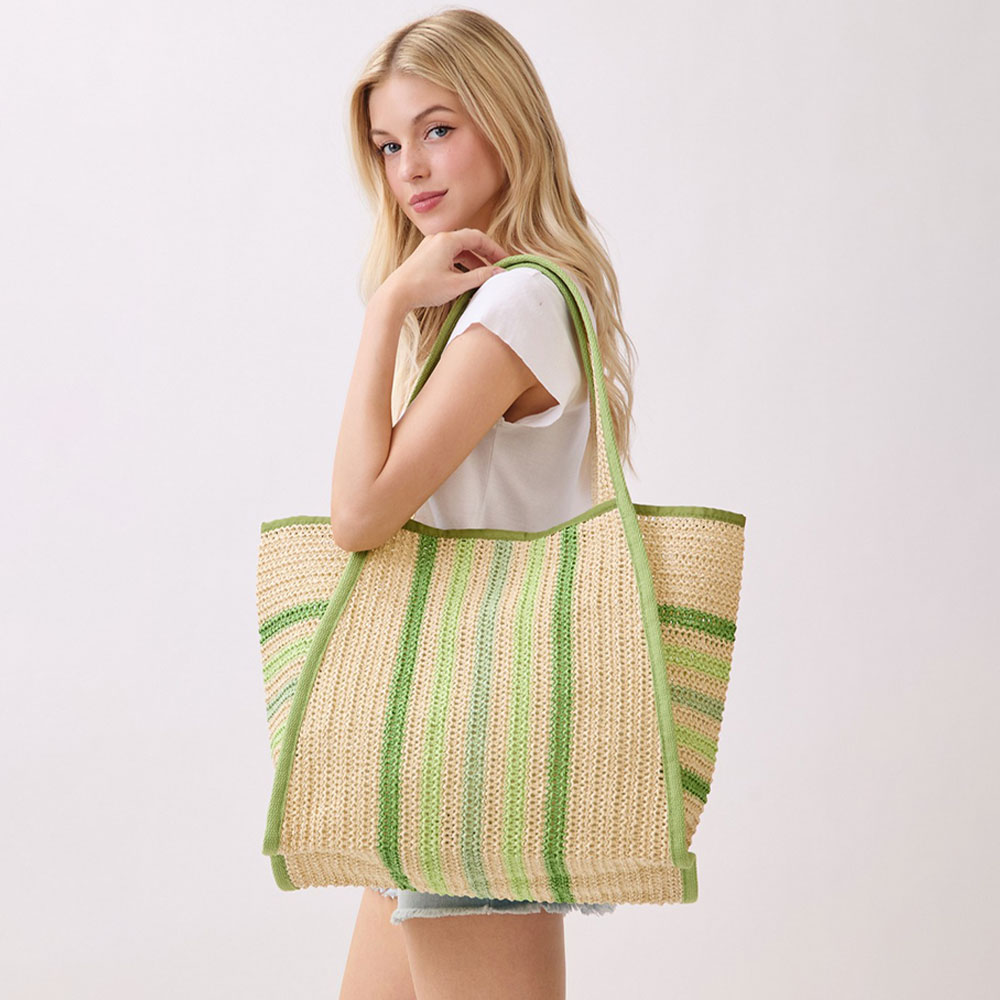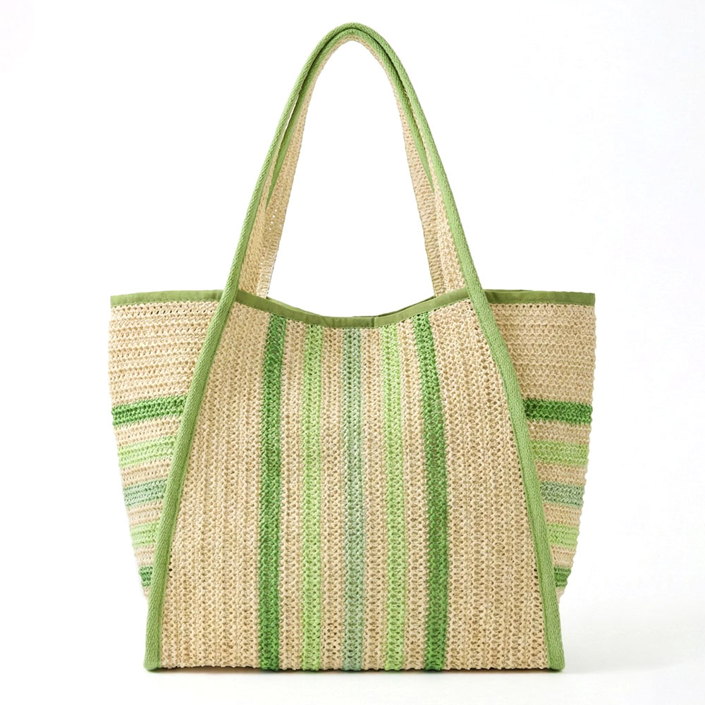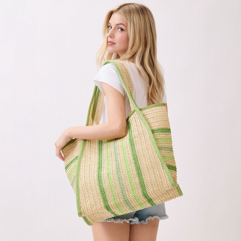 Details • Size : 20" X 14" X 5.5" • Inner Pocket • Magnetic Snap Closure • Material : 100% Paper • Spacious oversized tote bag designed for everyday carry, travel, shopping, and beach use. Features a structured silhouette with vertical stripe detailing, comfortable shoulder straps, and an open interior for easy access. A versatile statement bag ideal for boutique and lifestyle collections.