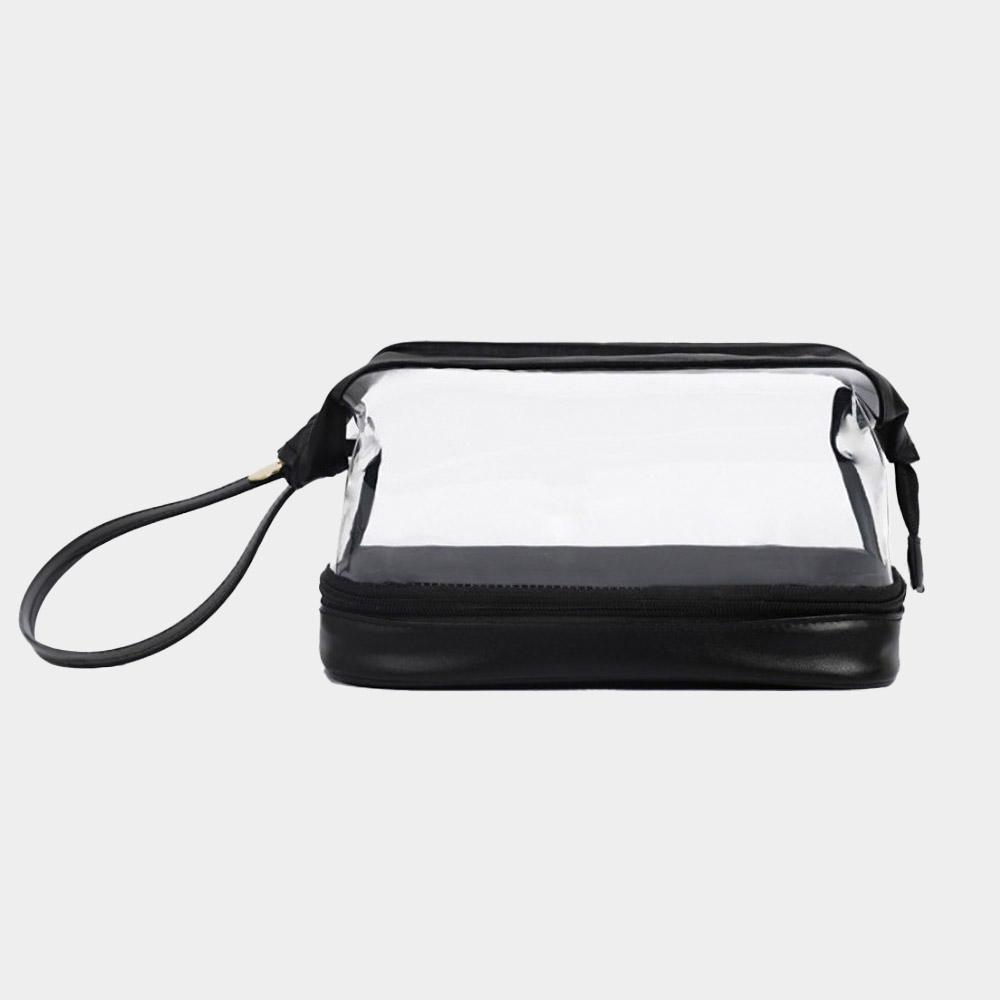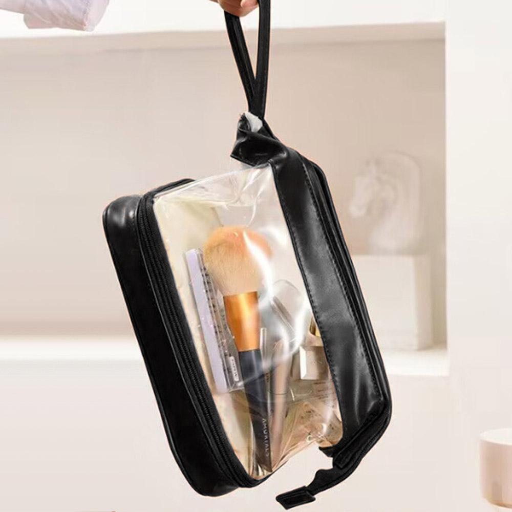 Details • Size : 10" X 7.5" X 6" • Zipper Closure • Material : 100% PU • Keep your essentials neat and visible with this black transparent travel pouch bag. Designed with a clear front and durable zipper closure, it’s perfect as a cosmetic case, toiletry organizer, or storage for makeup brushes and accessories, making travel and daily use stylishly practical.