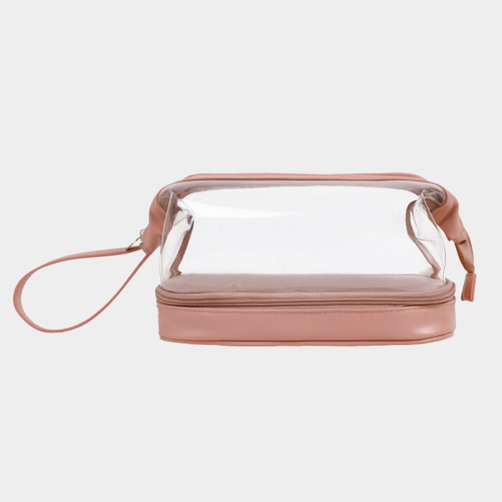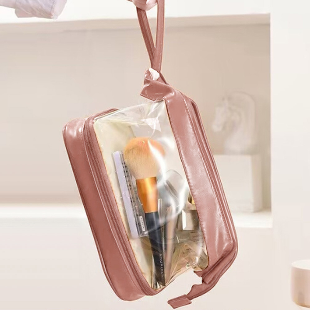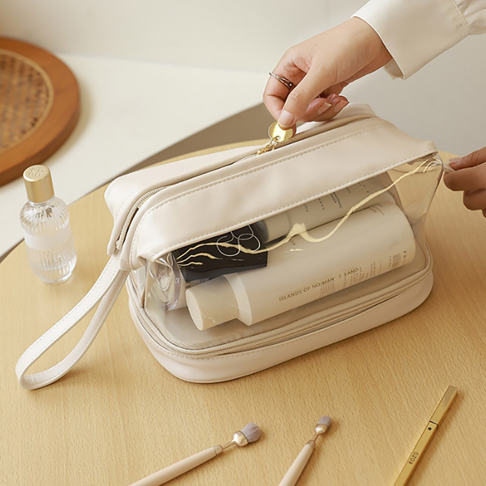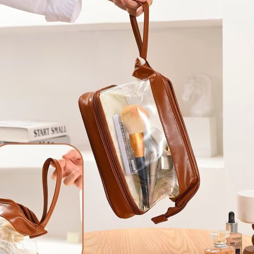 Details • Size : 10" X 7.5" X 6" • Zipper Closure • Material : 100% PU • Keep your essentials neat and visible with this black transparent travel pouch bag. Designed with a clear front and durable zipper closure, it’s perfect as a cosmetic case, toiletry organizer, or storage for makeup brushes and accessories, making travel and daily use stylishly practical.