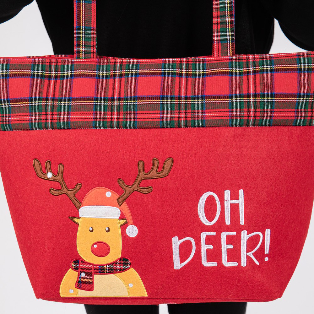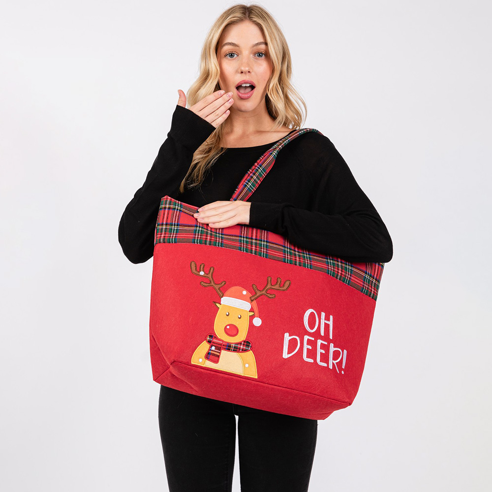 Details • Size : 19" X 13" X 6" • Zipper Closure • Material: 100% Polyester • Festive tote bag featuring a playful reindeer and "Oh Deer!" message. Designed with a plaid trim and sturdy handles, perfect for holiday shopping, gifting, or carrying seasonal essentials in style.