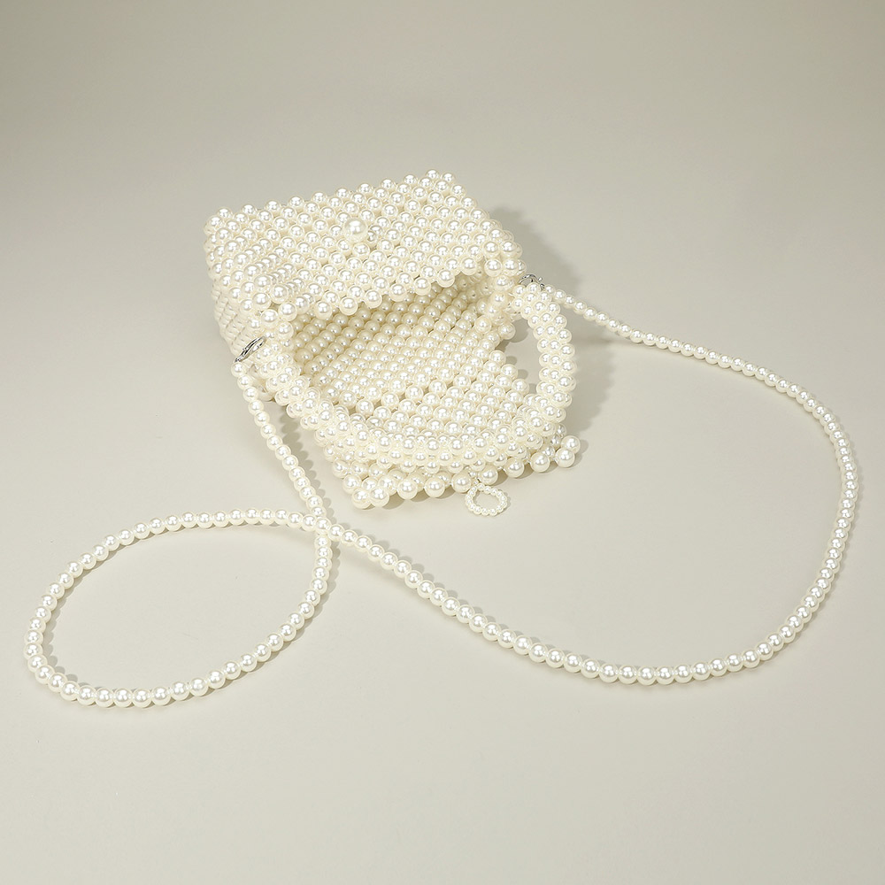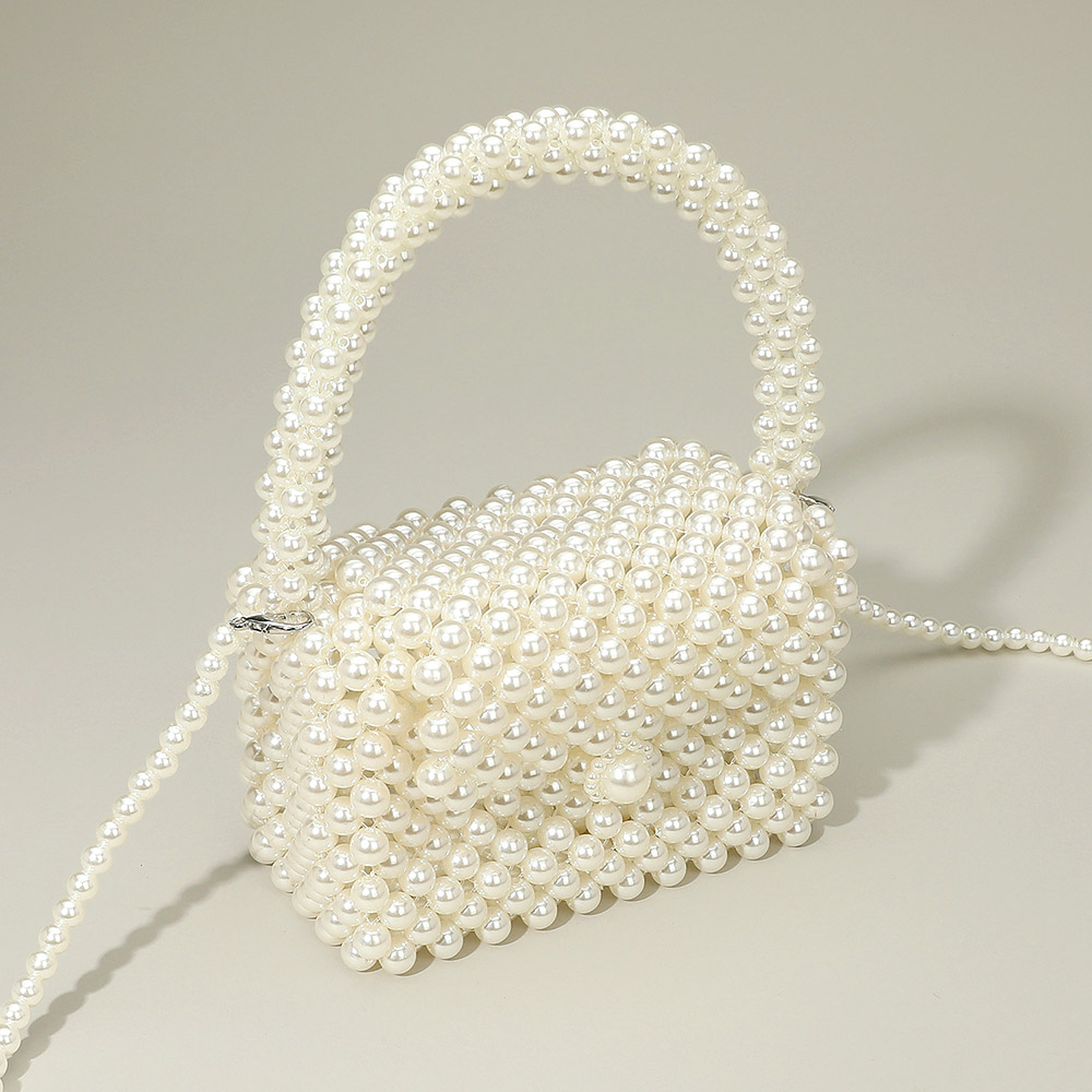 Details • Size : 5.5" X 4" X 3" • Top Handle Size : 3" L • Strap Size : 44" L / Detachable • Mini handbag fully embellished with polished beading, featuring a structured top handle, secure flap closure, and matching crossbody strap. A refined statement piece for weddings, events, or upscale gatherings.