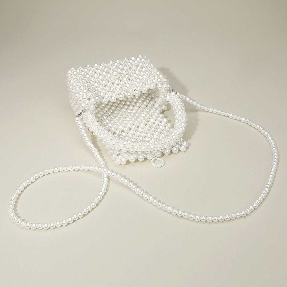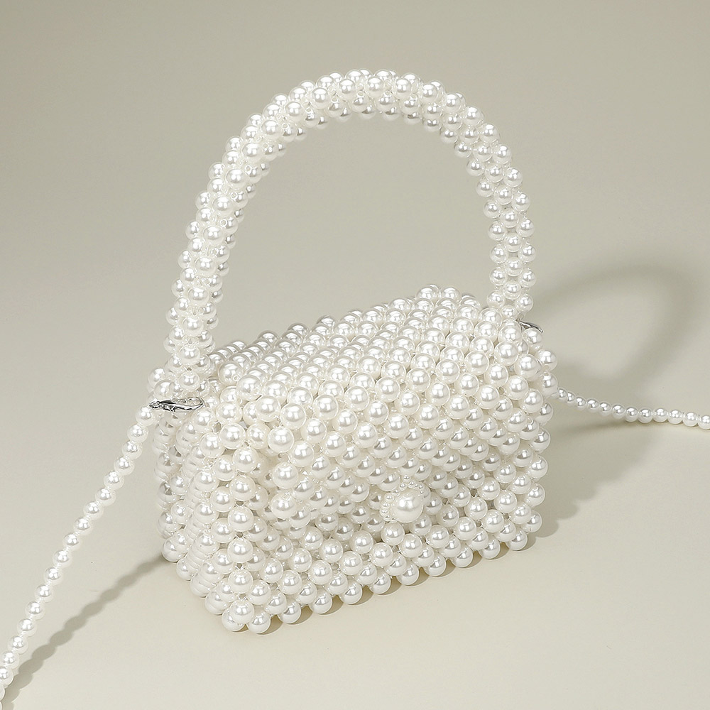 Details • Size : 5.5" X 4" X 3" • Top Handle Size : 3" L • Strap Size : 44" L / Detachable • Mini handbag fully embellished with polished beading, featuring a structured top handle, secure flap closure, and matching crossbody strap. A refined statement piece for weddings, events, or upscale gatherings.