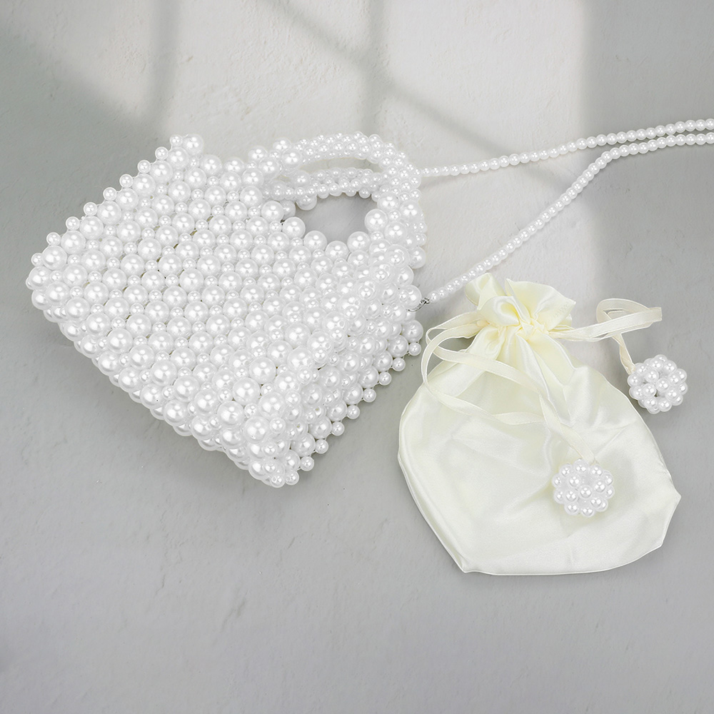 Details • Size : 7" X 5" X 2" • Top Handle Size : 2.5" L • Strap Size : 44" L / Detachable, Adjustable • Inside Pouch Size : 5" X 6.75" • Chic mini handbag featuring a structured pearl beaded exterior, dual handles, and a soft drawstring pouch. Ideal for weddings, parties, or formal events, it adds a refined and unique flair to any ensemble.