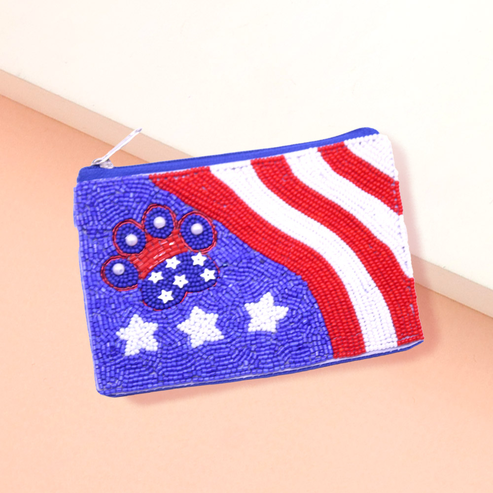 Pearl Pointed Paw American USA Flag Pattern Seed Beaded Mini Pouch Bag