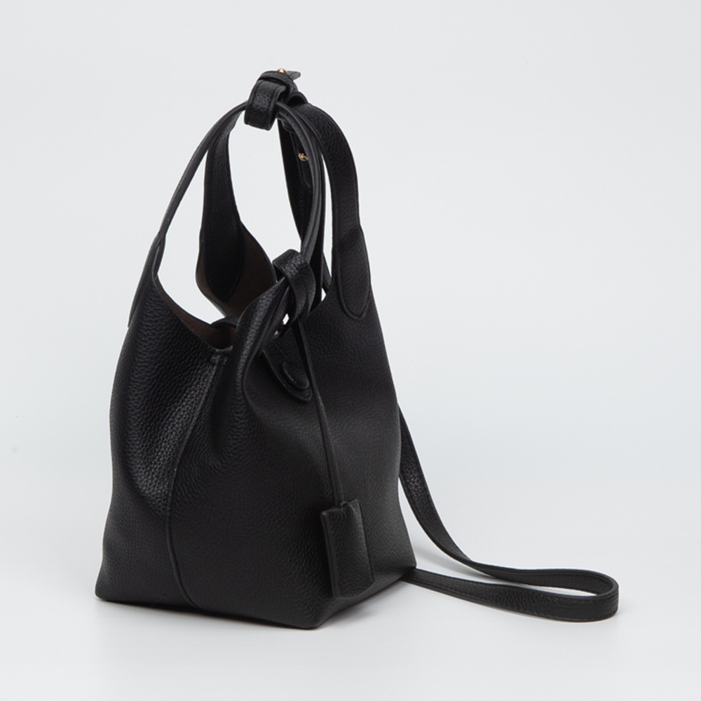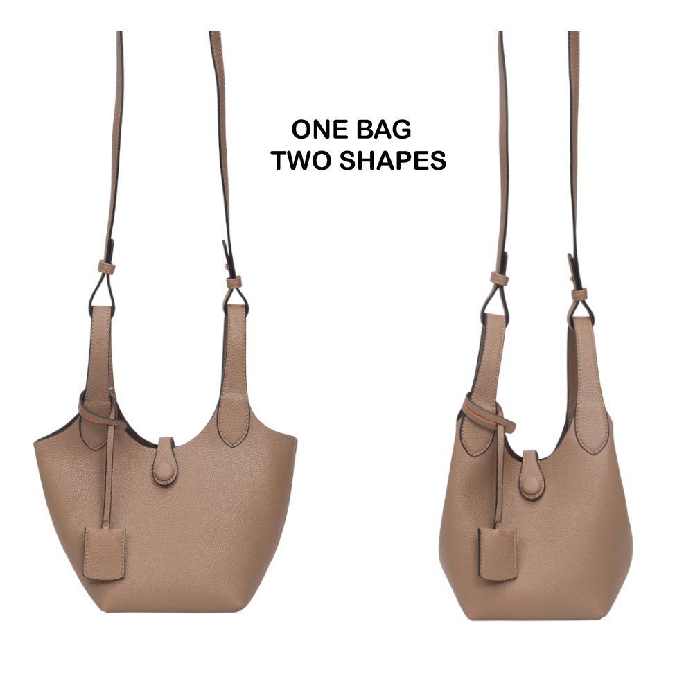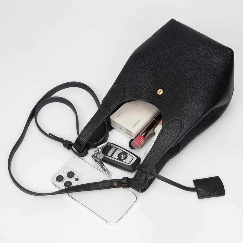 Details • Size : 5" X 5" X 12" • Top Handle Size : 4" L • Keychain Tag Size : 8" L, 1.6" X 2" • Strap Size : 42" L / Detachable • Discover the perfect blend of style and practicality with this pebbled faux leather bucket crossbody bag. Designed with a spacious interior, adjustable strap, and sleek silhouette, it’s ideal for carrying essentials like phone, keys, and makeup while keeping your look modern and versatile for daily wear.