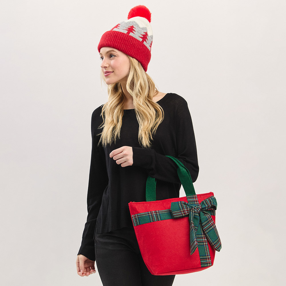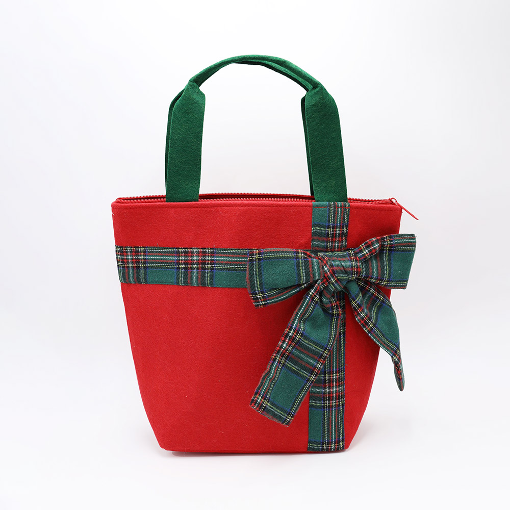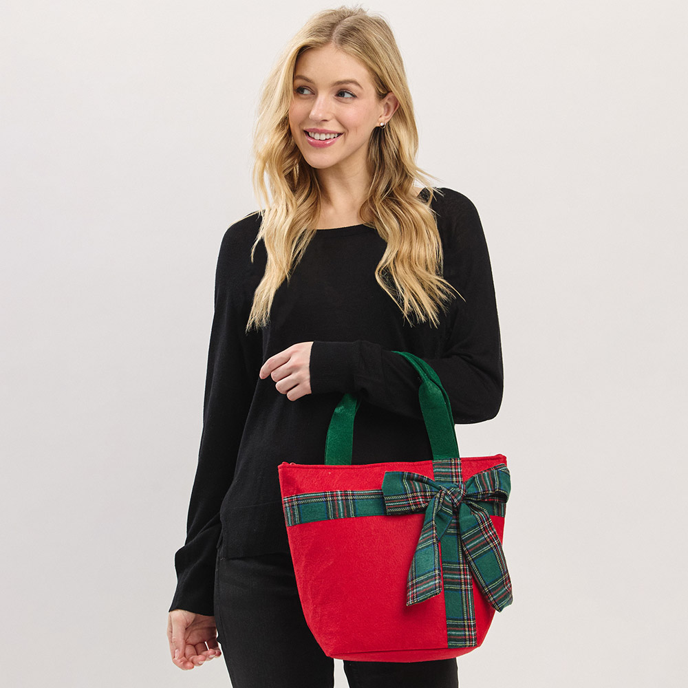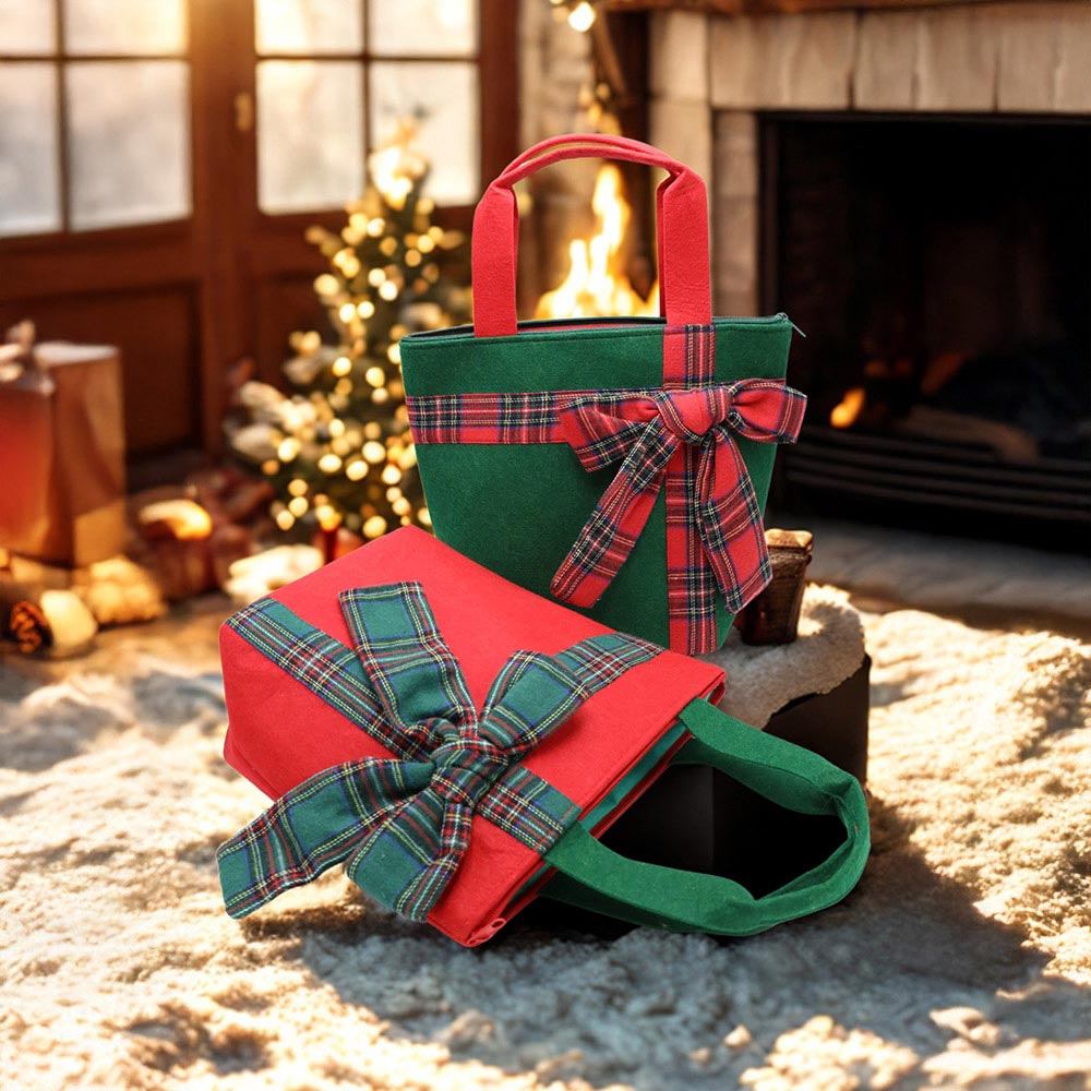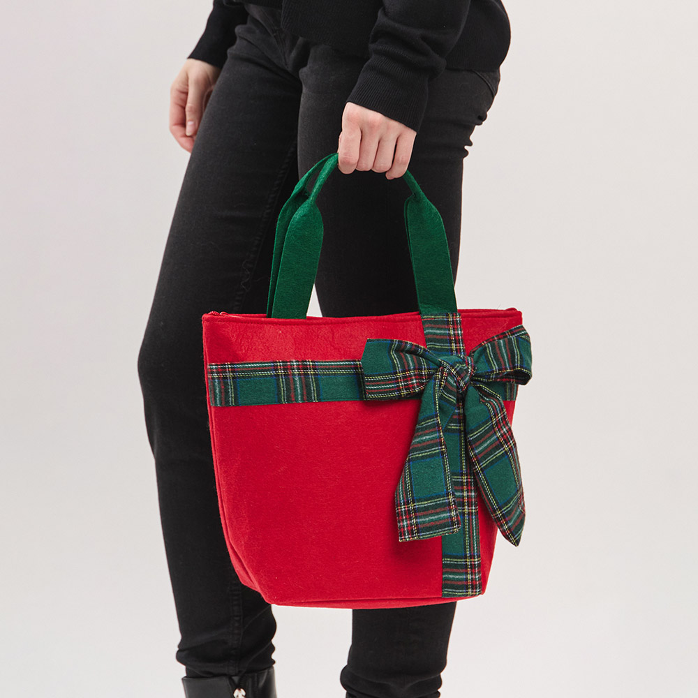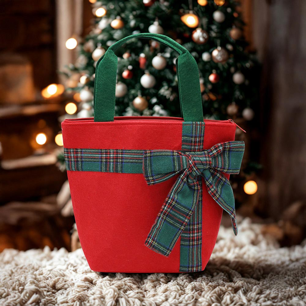 Details • Size : 13" X 10.5" X 5" • Material : 100% Polyester • Celebrate the season with this reusable holiday tote, designed with a festive plaid bow and sturdy handles. Ideal for gifting, shopping, or decorating, this Christmas-themed bag offers both charm and function for all your seasonal needs. A cheerful touch to any celebration.