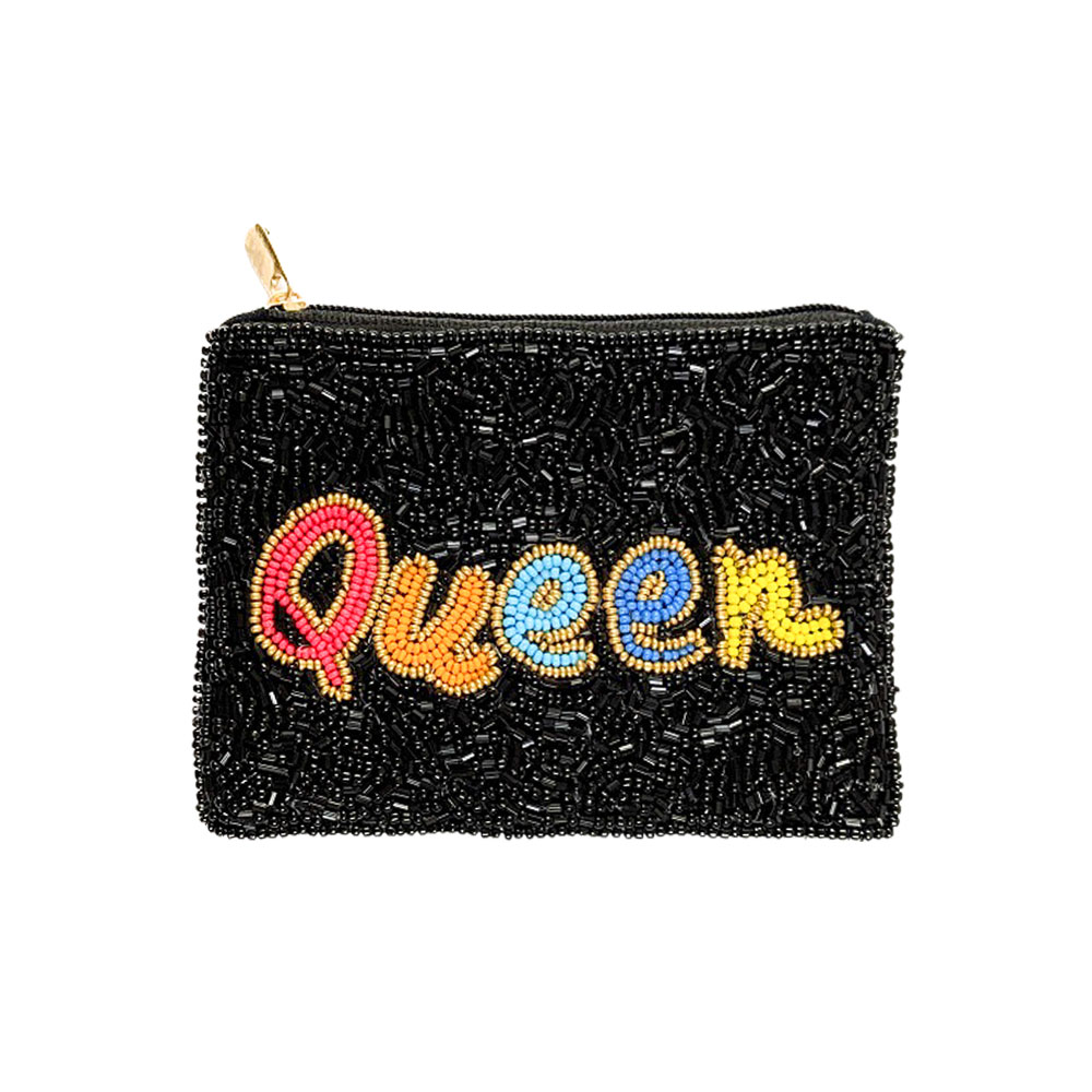 Details • Size : 5" X 3.75" • No Inside Pocket • Beads On Front Only • Zipper Closure • Make a bold statement with this beaded "Queen" pouch, designed with multicolor lettering and shimmering details. Perfect for storing essentials with flair, this compact accessory is a fun, empowering gift or a stylish way to show off your royal confidence every day. • Made In India