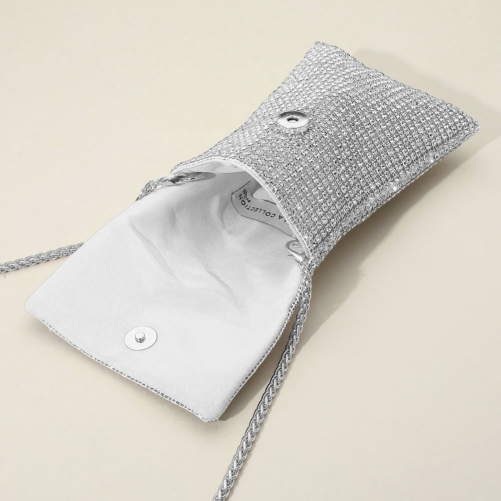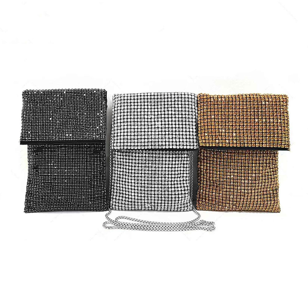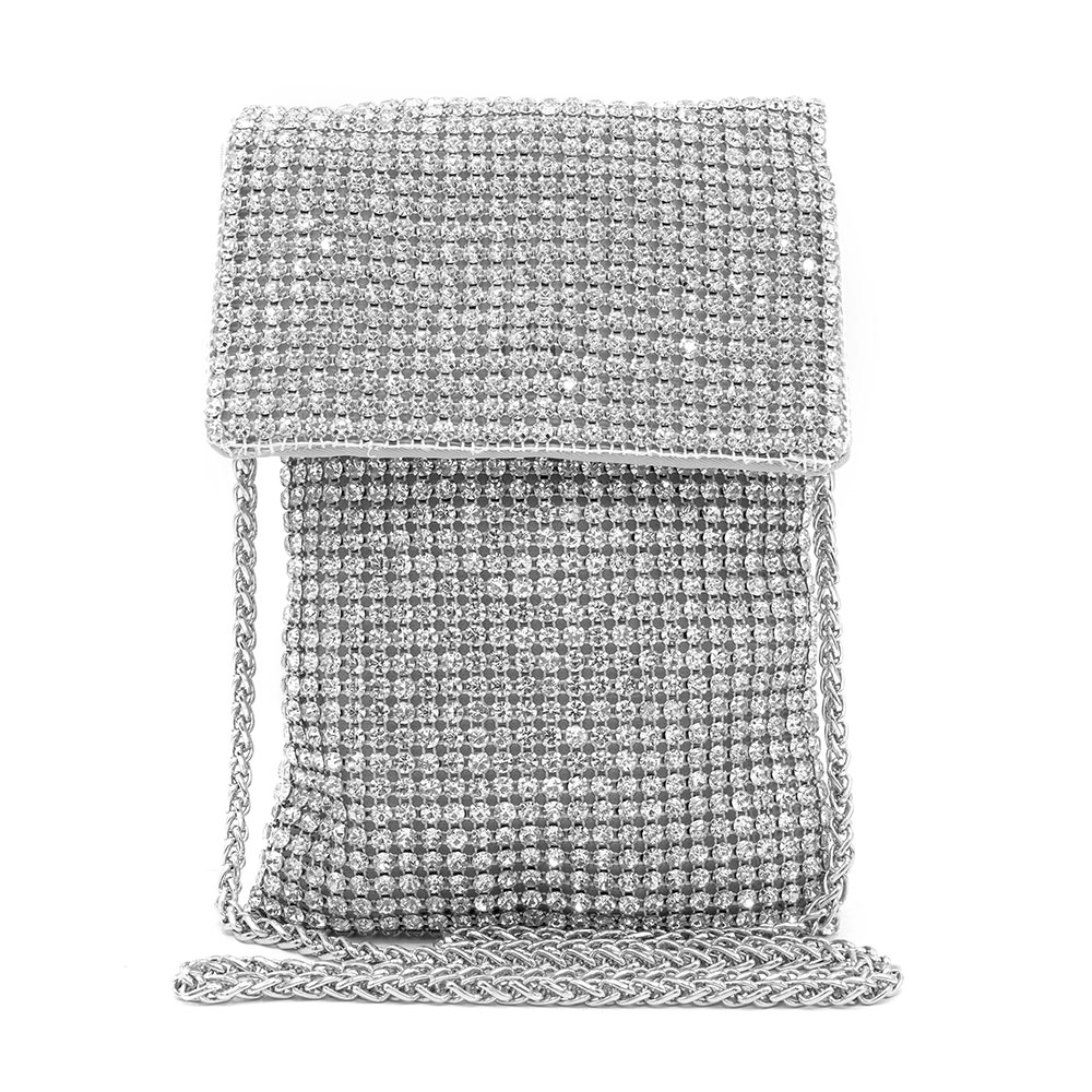 Details • Size : 5.25" X 7.25" X 0.75" • Strap Size : 40" L / Detachable • Magnetic Closure • Chic mini evening bag with shimmering rhinestone overlay and chain strap. Compact design perfect for carrying essentials at parties, weddings, or night outings. Adds sparkle to any outfit.
