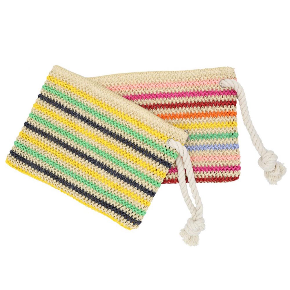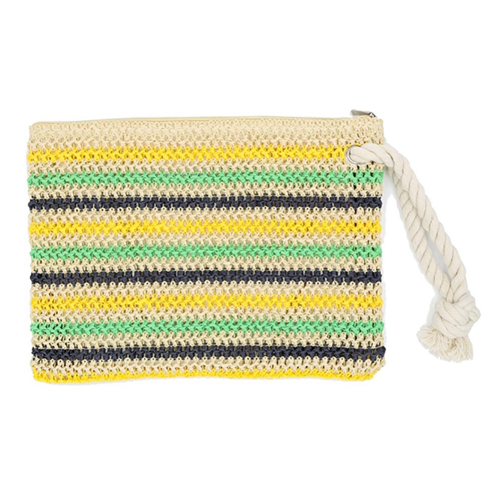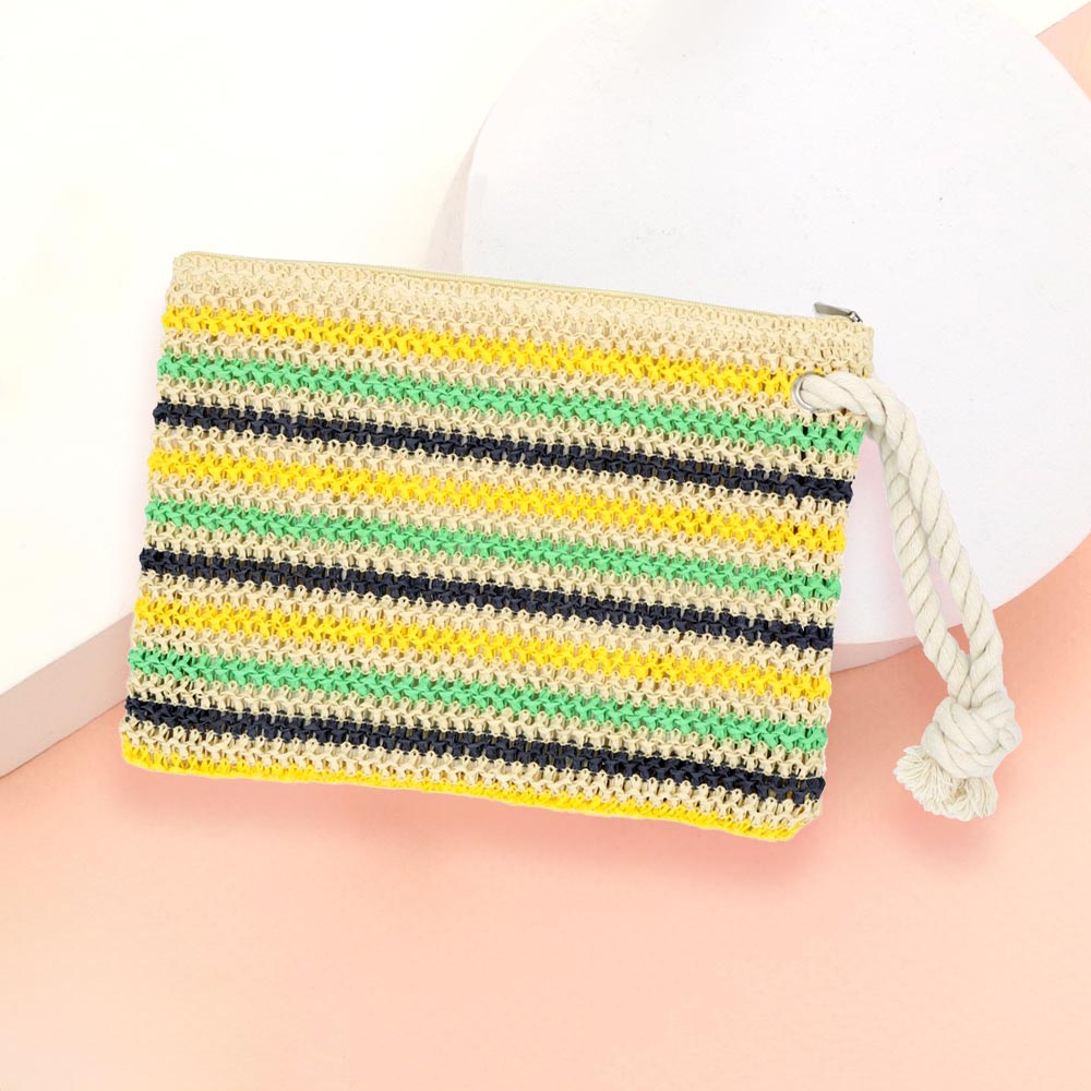 Rope Handle Multi Color Striped Straw Crochet Pouch Bag