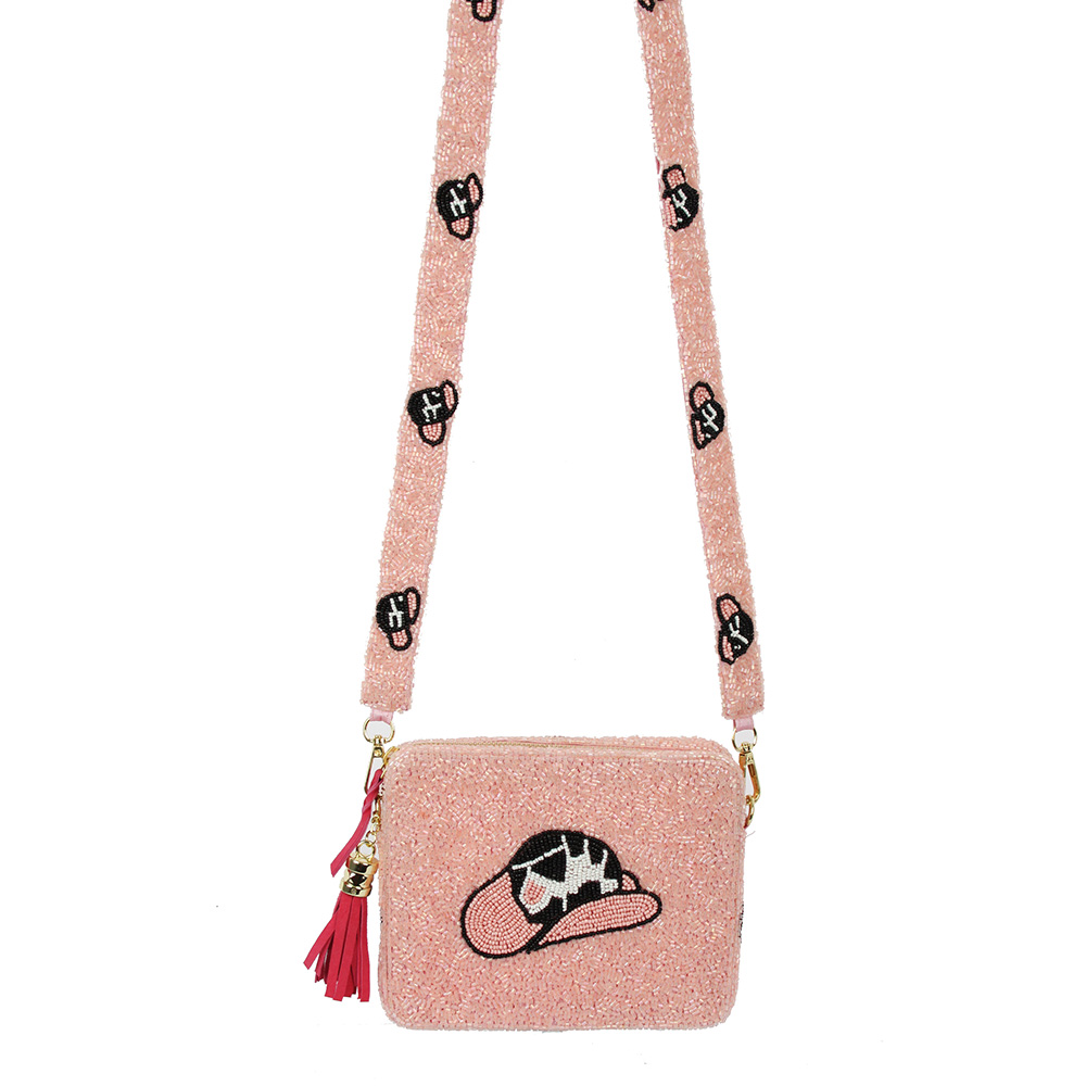 Seed Beaded Cowboy Hat Accented Rectangle Tassel Crossbody Bag