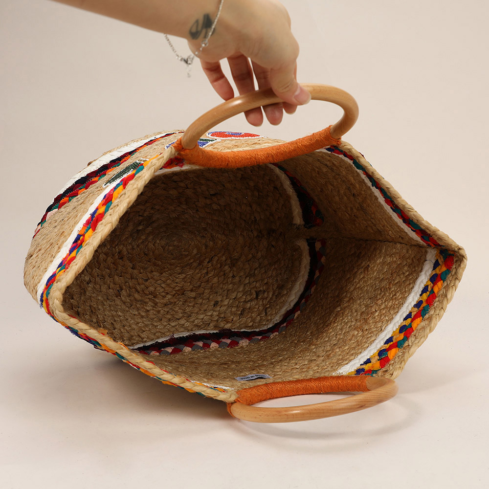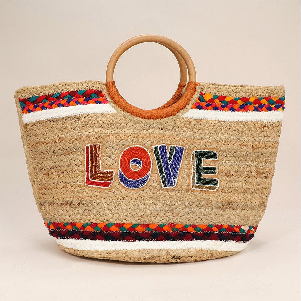Seed Beaded LOVE Message Pointed Wooden Handle Jute Handbag