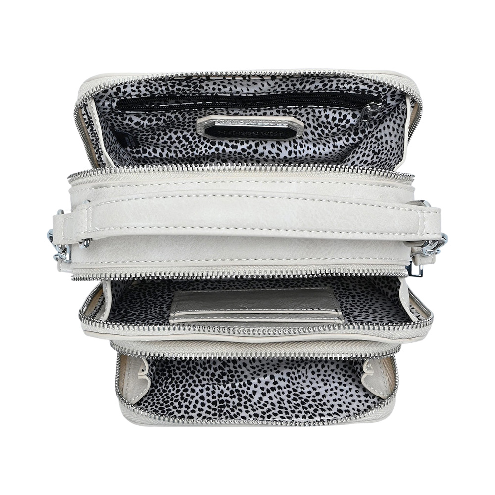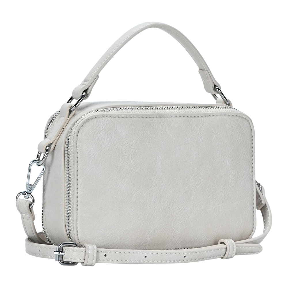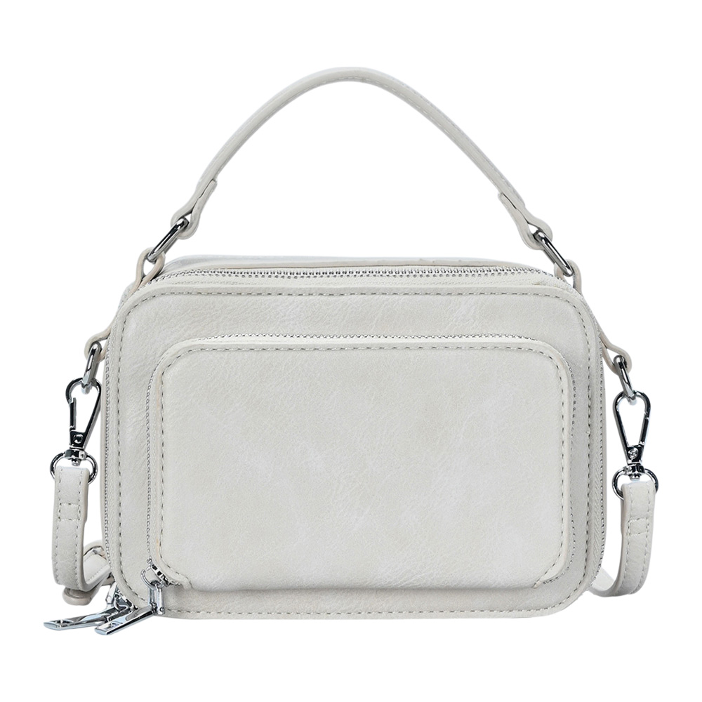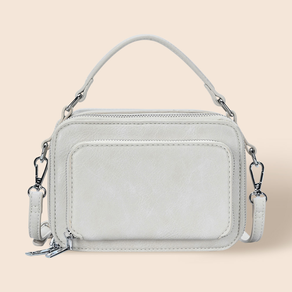 • Compact crossbody handbag with top handle, zip compartments, and detachable strap. Ideal for everyday essentials and versatile for hands-free convenience.