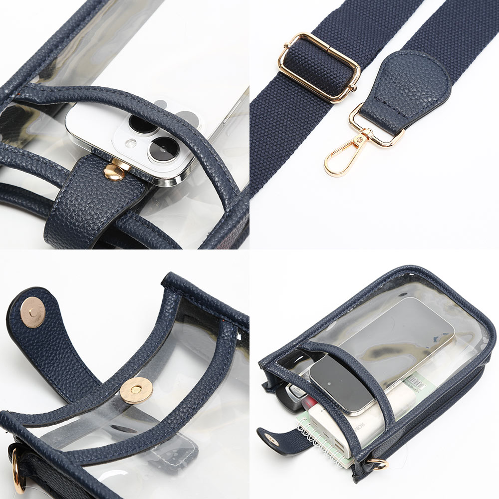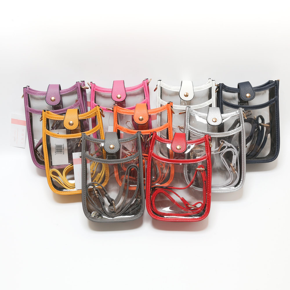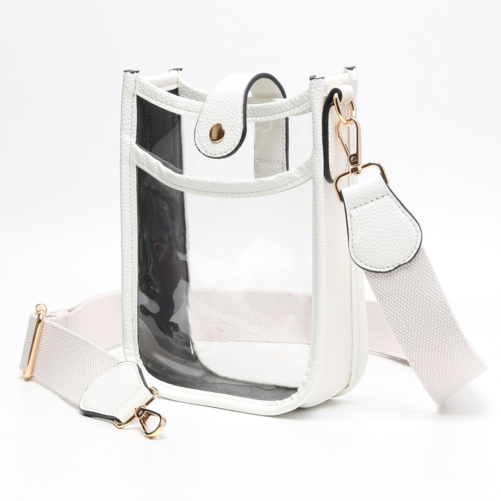 Details • Size : 5.5" X 7.9" X 2" • Strap Size : 41" L / Adjustable, Detachable • One Outside Slip Pocket • Magnetic Snap Button Closure • Compact transparent crossbody bag with faux leather trim and adjustable wide strap. Stadium-approved design ideal for concerts, festivals, and sporting events. Secure snap closure and stylish silhouette.