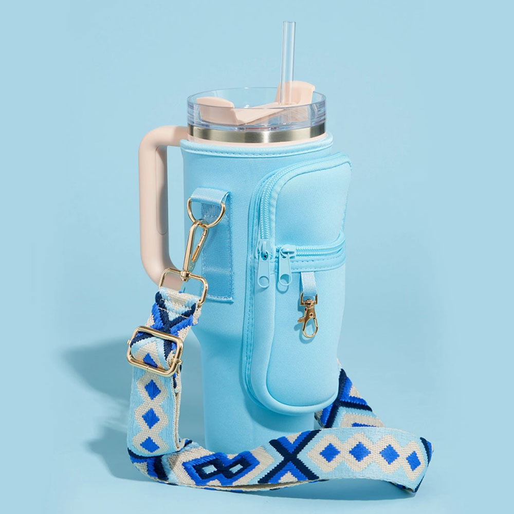 Solid Tumbler Carrier Holder Aztec Pattern Strap Crossbody Bag