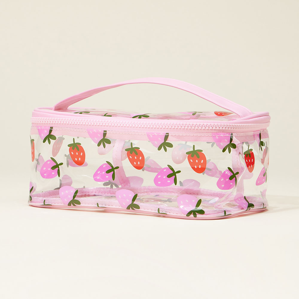 Top Handle Strawberry Pattern Transparent Cosmetic Pouch Bag