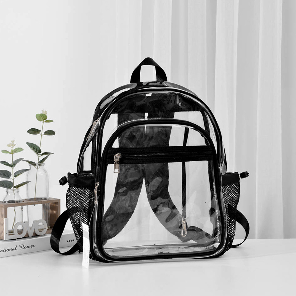 Details • Bag Size : 12" X 14.5" X 5" • Strap : Adjustable • Two Bottle Pockets • Zipper Closure • Stay organized and on-trend with this transparent backpack featuring black trim, adjustable straps, and multiple zippered compartments. Ideal for concerts, school, or travel where clear bags are required.