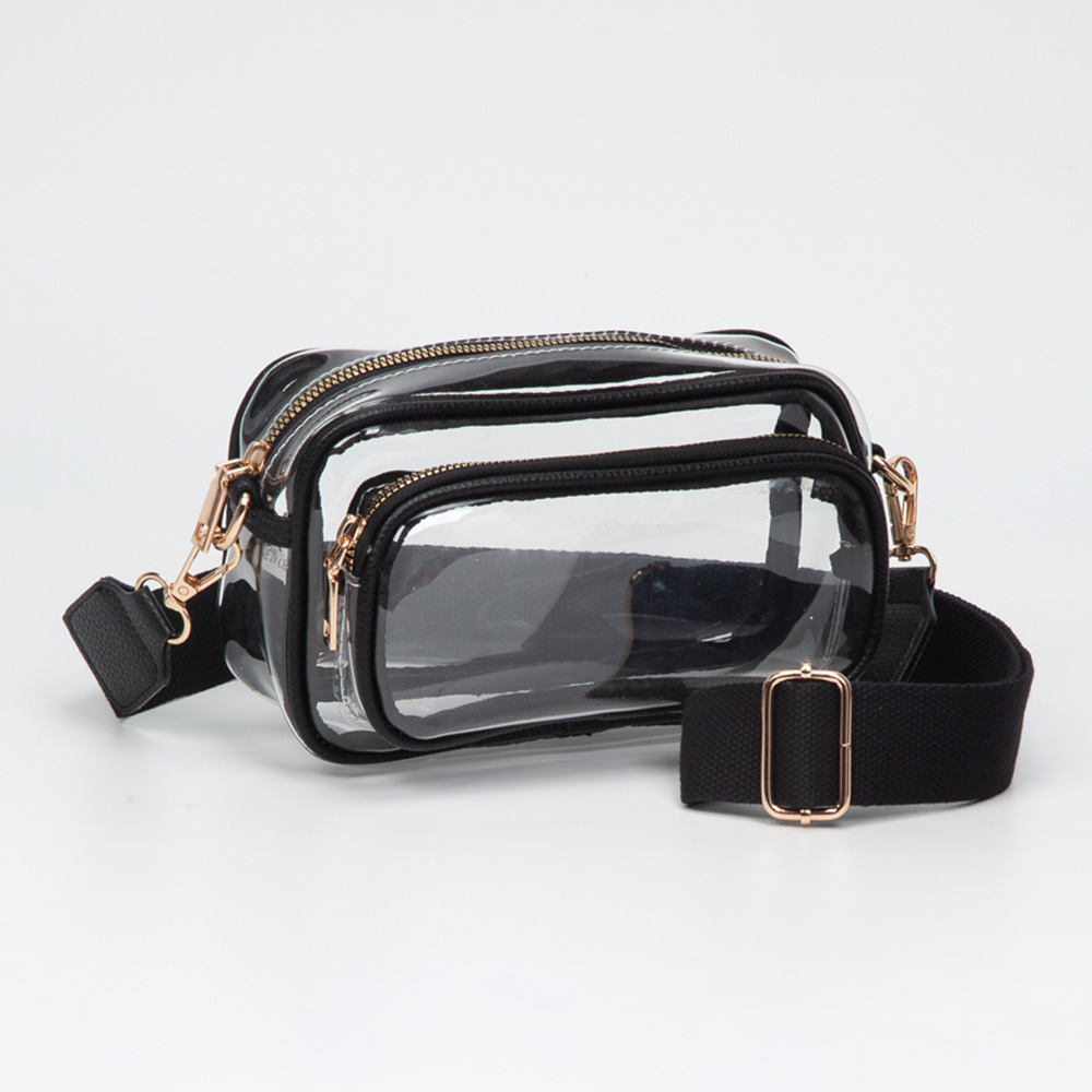 Details • Size : 8" X 5" X 3.5" • Strap Size : 53" L / Detachable, Adjustable • One Outside Zipper Pocket • Zipper Closure • Be game day ready with this clear stadium-approved crossbody bag, featuring white trim, dual zip compartments, and an adjustable strap for hands-free comfort. Perfect for concerts, sporting events, festivals, and venues with clear bag policies, offering style, security, and convenience on the go.