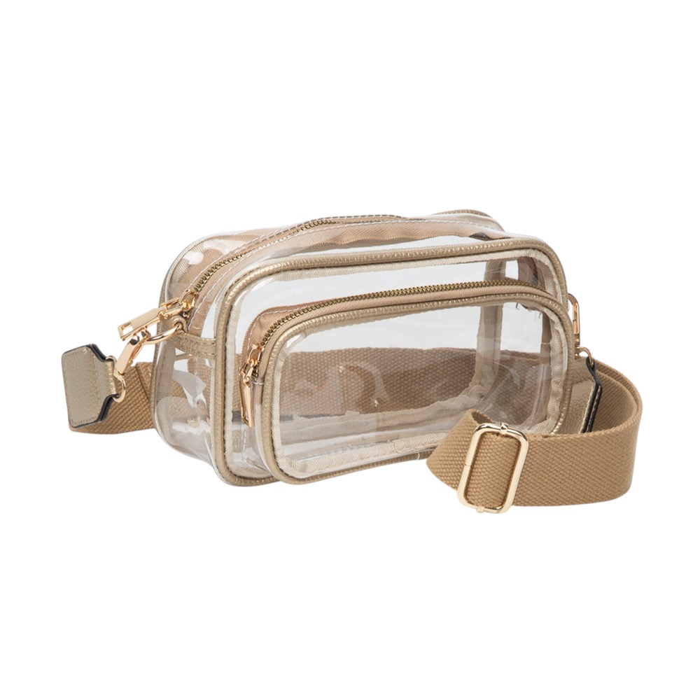 Details • Size : 8" X 5" X 3.5" • Strap Size : 53" L / Detachable, Adjustable • One Outside Zipper Pocket • Zipper Closure • Be game day ready with this clear stadium-approved crossbody bag, featuring white trim, dual zip compartments, and an adjustable strap for hands-free comfort. Perfect for concerts, sporting events, festivals, and venues with clear bag policies, offering style, security, and convenience on the go.