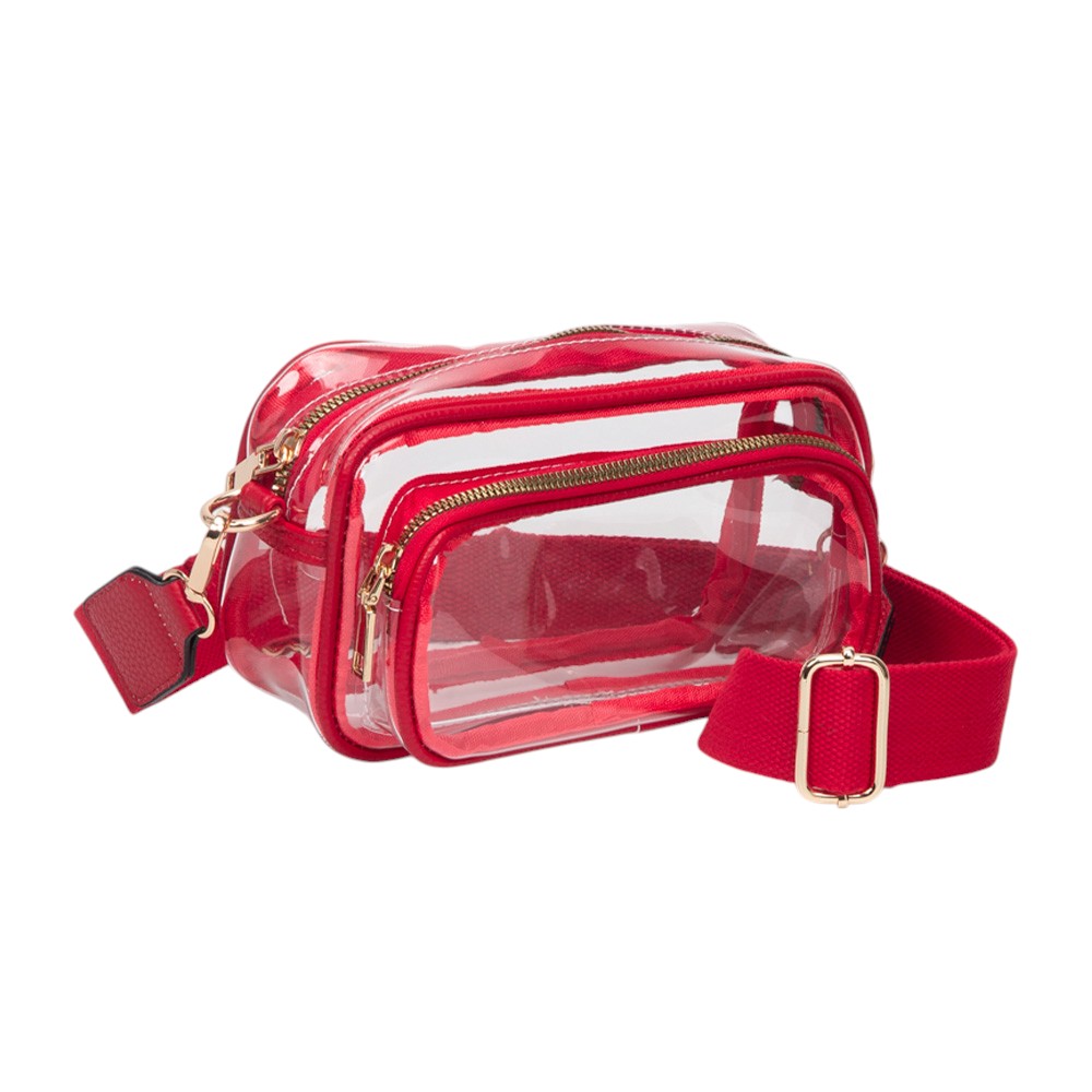 Details • Size : 8" X 5" X 3.5" • Strap Size : 53" L / Detachable, Adjustable • One Outside Zipper Pocket • Zipper Closure • Be game day ready with this clear stadium-approved crossbody bag, featuring white trim, dual zip compartments, and an adjustable strap for hands-free comfort. Perfect for concerts, sporting events, festivals, and venues with clear bag policies, offering style, security, and convenience on the go.