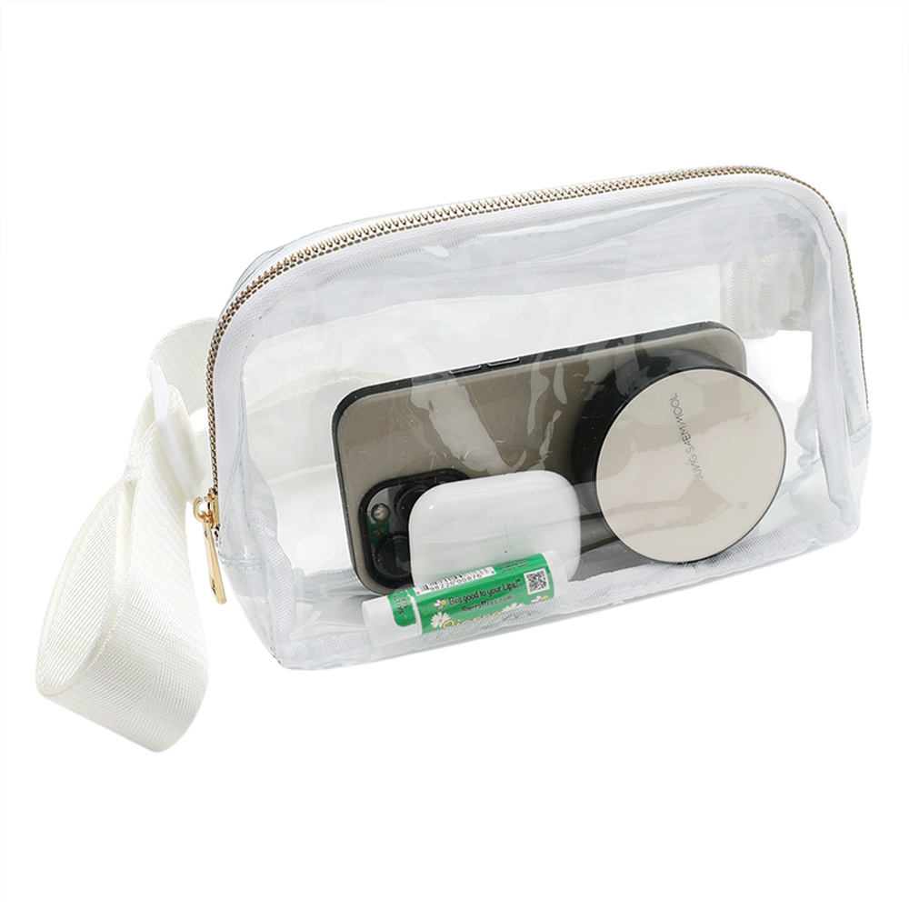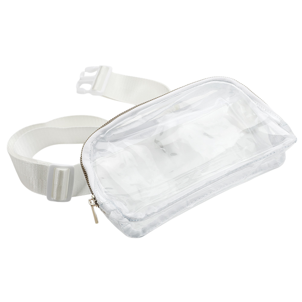 Details • Size : 9.1" X 5.5" X 1.75" • Strap Size : Adjustable • Zipper Closure • Material : 100% PVC/Polyester • Stay stylish and hands-free with this clear crossbody belt bag featuring a black adjustable strap and secure zipper closure. Perfect for concerts, festivals, and stadium events, this transparent bag offers convenience and compliance without sacrificing modern style.