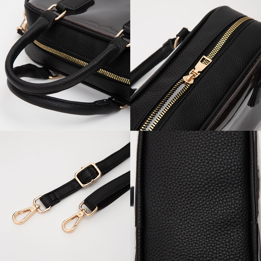 Details • Size : 10" X 5" X 3.5" • Top Handle Size : 3.25" L • Strap Size : 52" L / Adjustable, Detachable • Zipper Closure • Modern clear structured handbag featuring sturdy dual handles, an adjustable shoulder strap, and secure zip closure. Perfect for events, travel, or everyday use where style meets practicality with a transparent, easy-to-clean design.