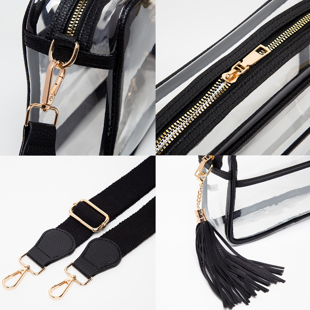 • Practical and stylish clear crossbody bag with zipper closure, tassel accent, and adjustable detachable strap for comfortable wear. Perfect for concerts, stadiums, festivals, or daily use where clear bags are required, offering secure storage and easy visibility of essentials.