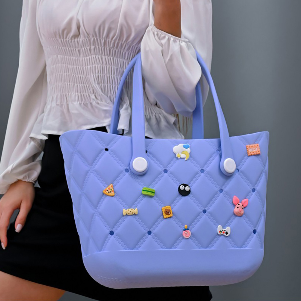 Details • Size : 16.5" X 11" • Material : 100% Polyester • Open-top design with secure button handles • Comfortable dual handles for hand or shoulder carry • Spacious interior with customizable charm holes • Perfect for work, shopping, travel, beach days, and everyday carry • Charms Included- ALL CHARMS ARE DIFFERENT & RANDOM FOR EACH BAG