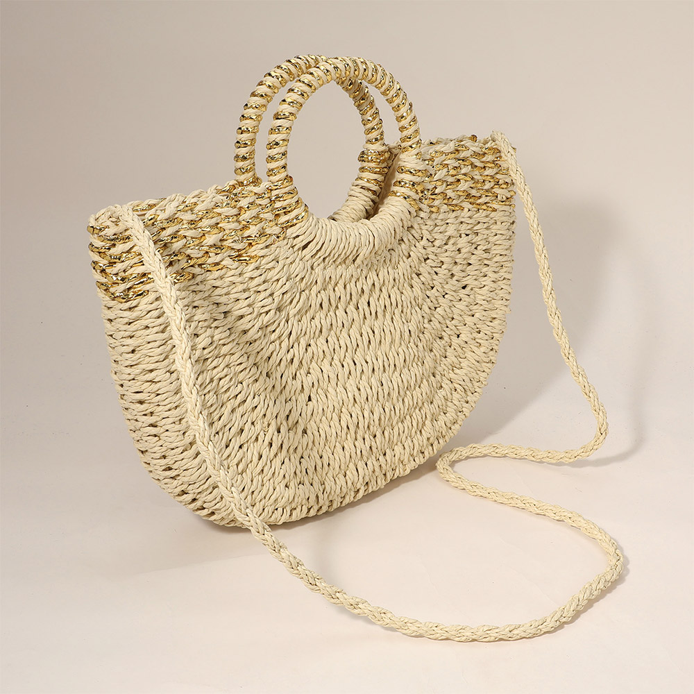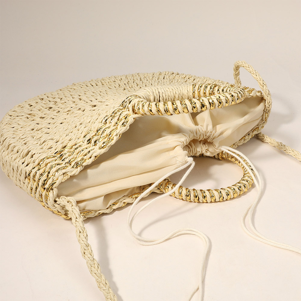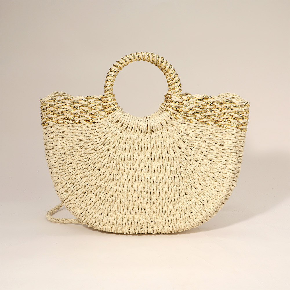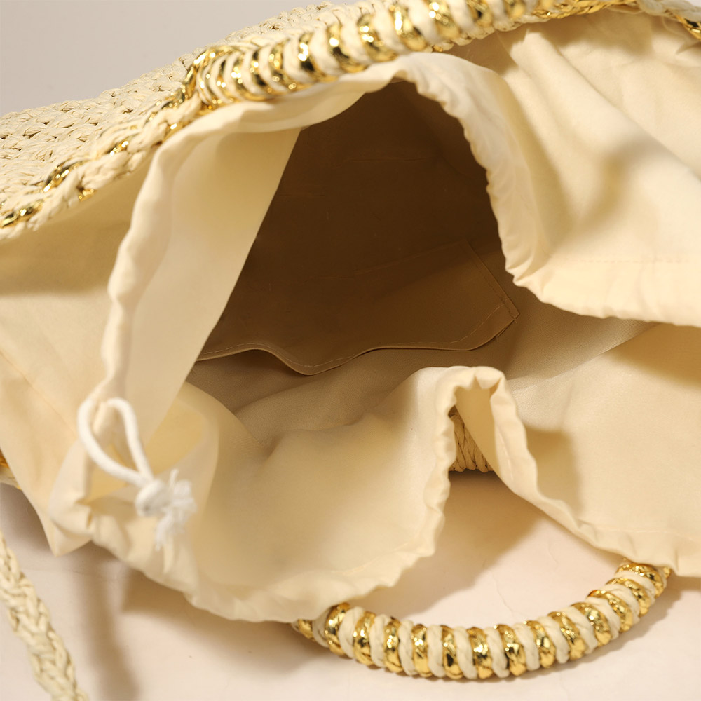 Details • Size : 16" X 11" X 2" • Top Handle Size : 5" L • Strap Size : 26" L • One Inside Slip Pocket • Drawstring Closure • Chic woven straw tote bag with circular handles and natural texture. A lightweight, spacious design ideal for beach trips, markets, or casual summer outings. Eco-friendly and handmade look. • Made In India