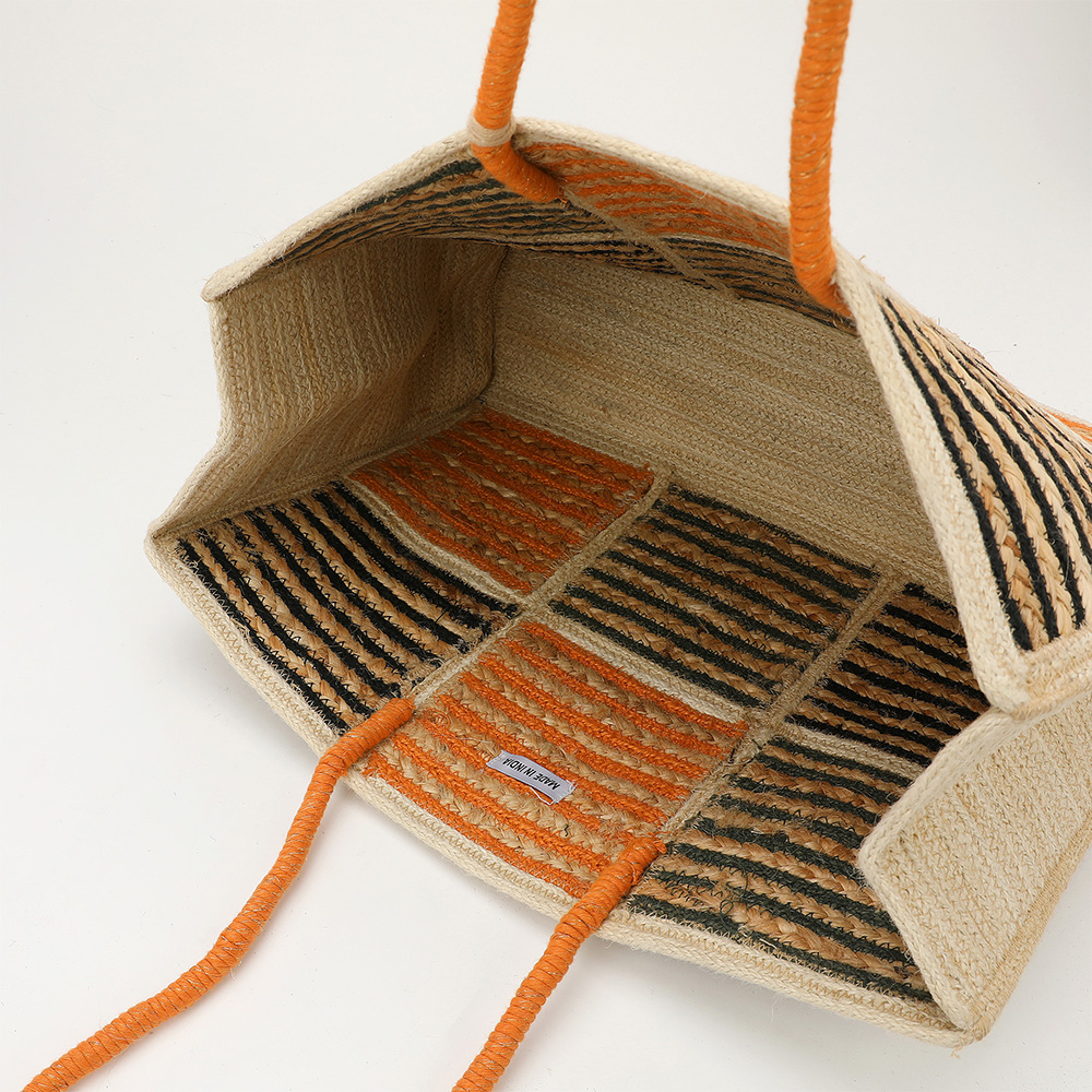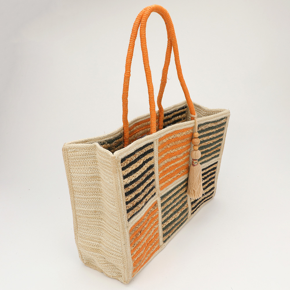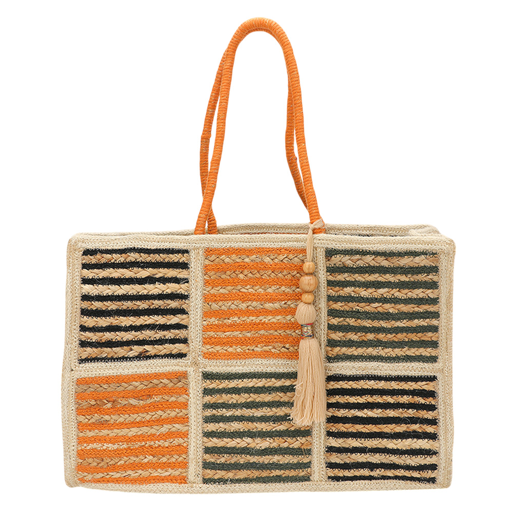 Details • Size : 17" X 11.5" X 5.75" • Strap Size : 9" L • Tassel Size : 10" L • Brighten your style with this woven straw tote featuring vibrant orange, black, and olive striped panels. With sturdy orange handles and a chic tassel charm, it’s perfect for everyday use or weekend getaways. • Made In India