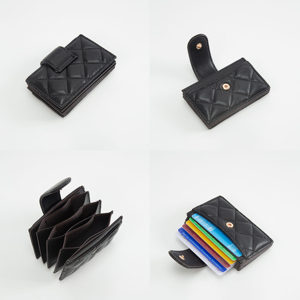 • This quilted snap closure card holder wallet combines elegance and practicality in a compact design. Featuring multiple slots for cards and essentials, it keeps your belongings organized and secure. Perfect for minimalists who value style and everyday convenience.