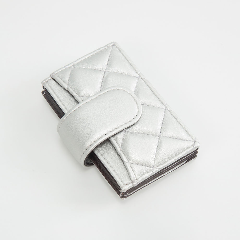 Details • Size : 4" X 3" X 1" • 6 Card Slots • Snap Button Closure • This quilted snap closure card holder wallet combines elegance and practicality in a compact design. Featuring multiple slots for cards and essentials, it keeps your belongings organized and secure. Perfect for minimalists who value style and everyday convenience.