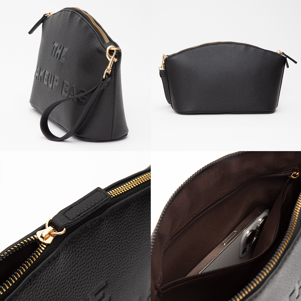 Details • Size : 10" X 6.25" X 3" • Zipper Closure • Strap Size : 7.5" L / Detachable • Stay organized in style with this vibrant colored makeup bag featuring embossed “THE MAKEUP BAG” text, a secure zip closure, and a convenient wrist strap. Made of durable faux leather – perfect for travel or everyday use.