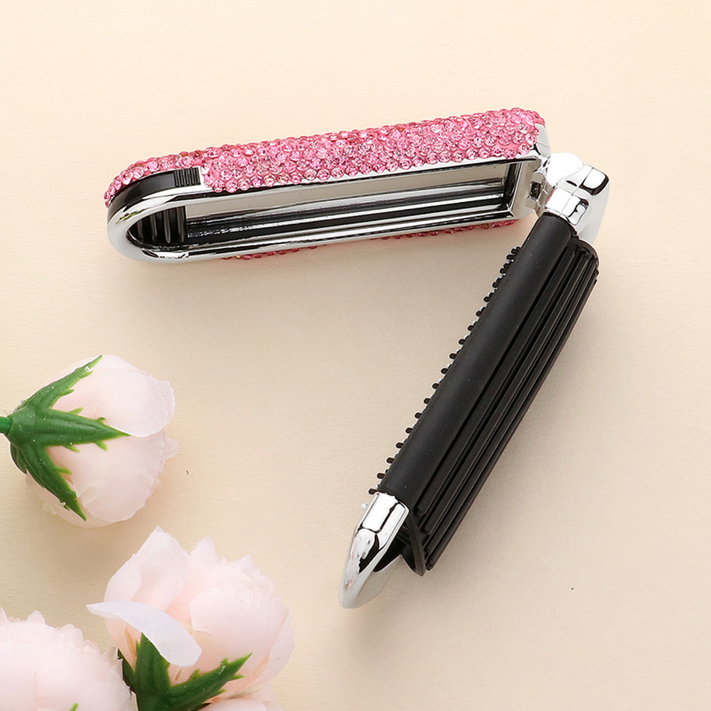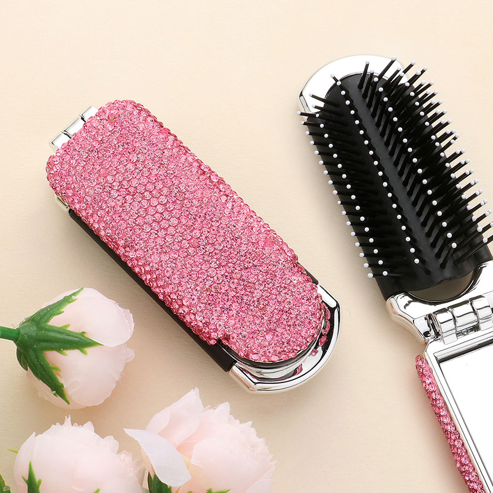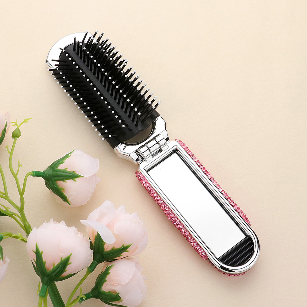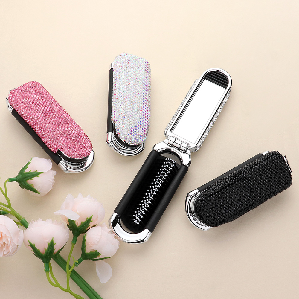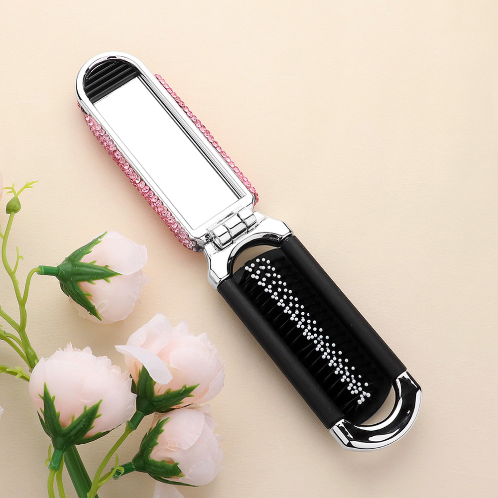 Details • Size : 1.5" X 4.25" (Unfolded : 8" L) • Travel Friendly • Compact foldable hair brush with built-in mirror and rhinestone exterior. Perfect for travel or on-the-go touch-ups, combining beauty and function in a stylish accessory. Lightweight and easy to carry.