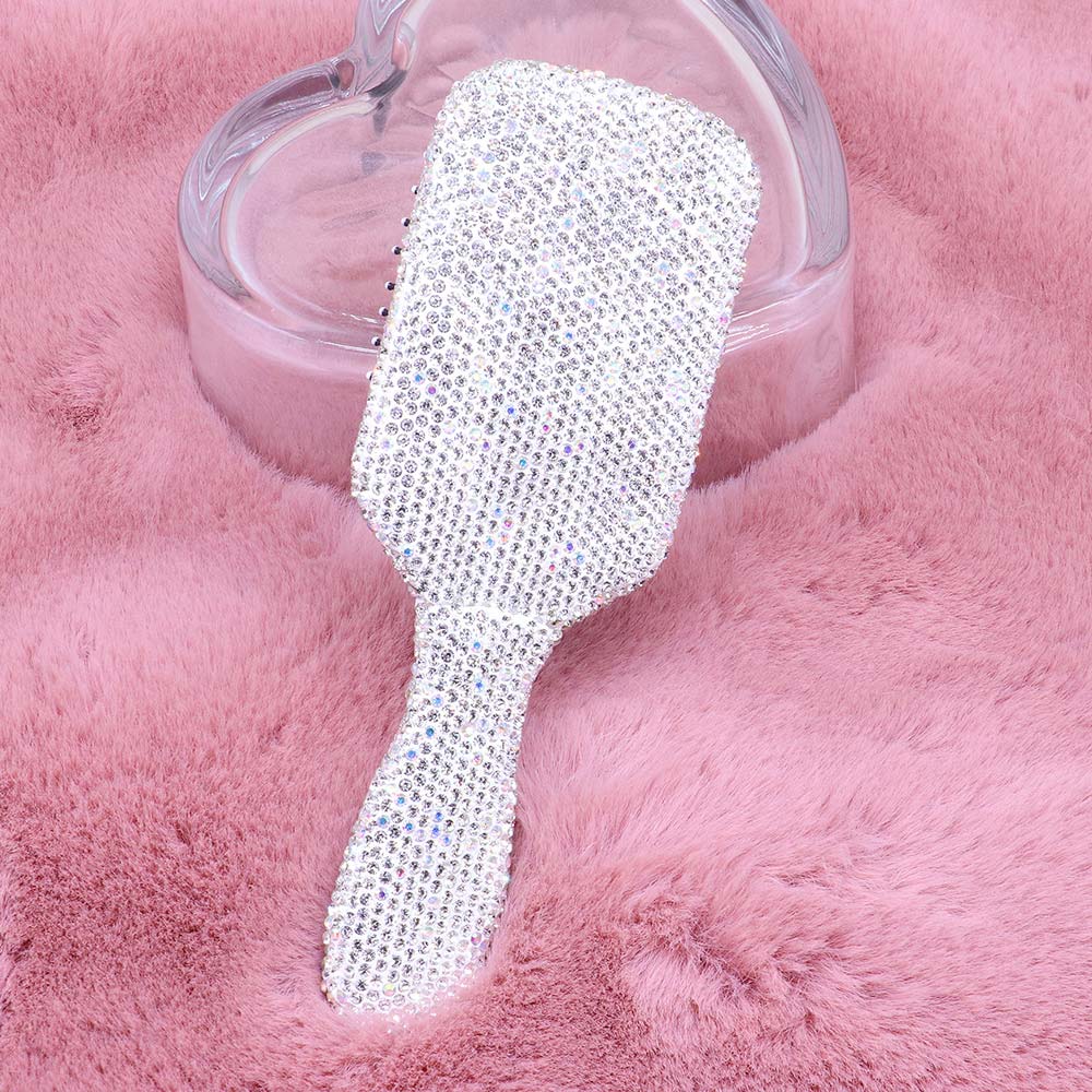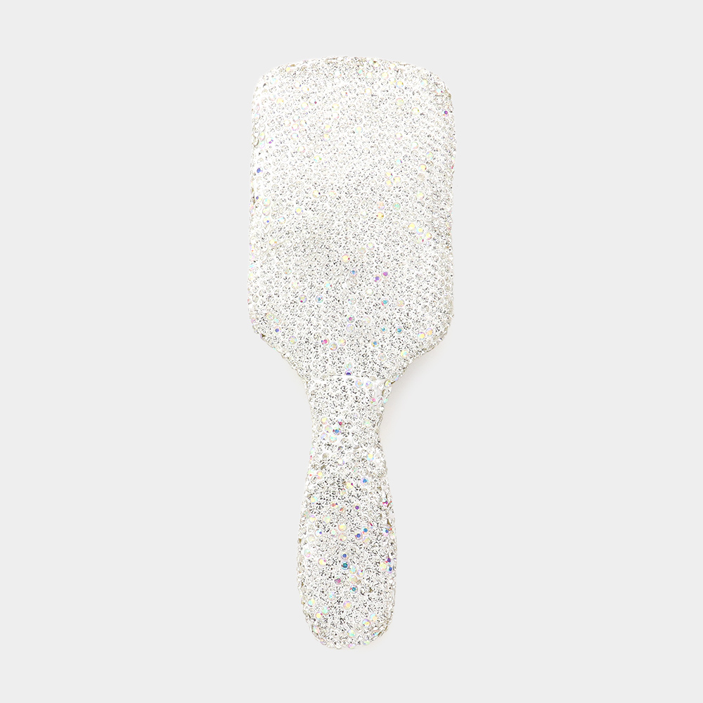• Elegant paddle hair brush adorned with rhinestones for a stylish touch. Ideal for detangling and smoothing hair with ease, featuring ball-tip bristles for gentle grooming.