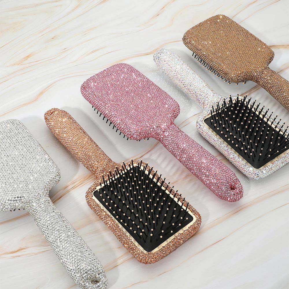 • Glamorous rhinestone paddle brush set with cushioned bases and ball-tip bristles. Ideal for detangling, smoothing, and styling hair comfortably with a luxurious look.