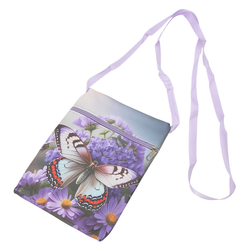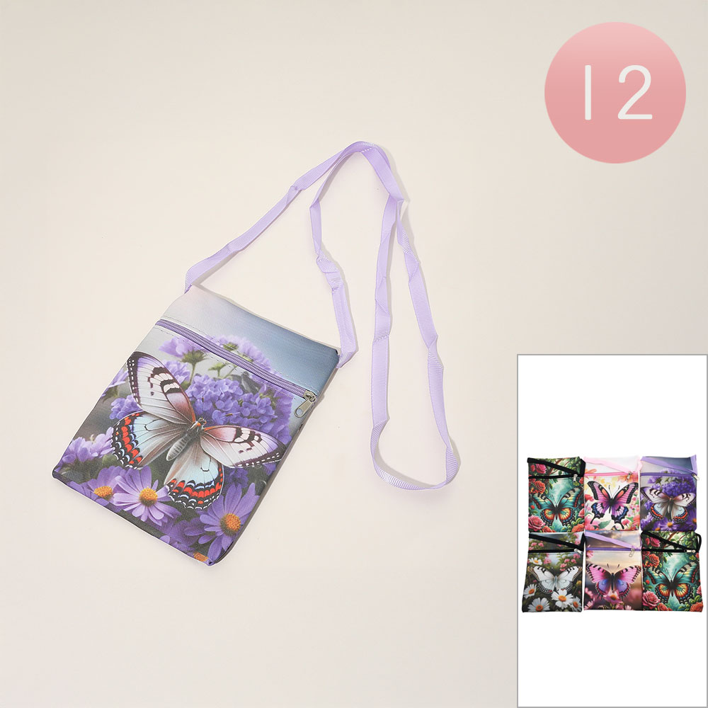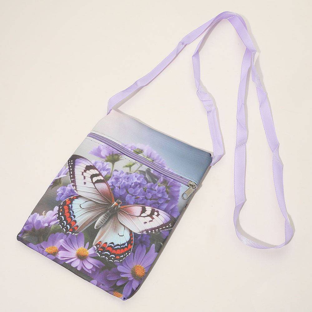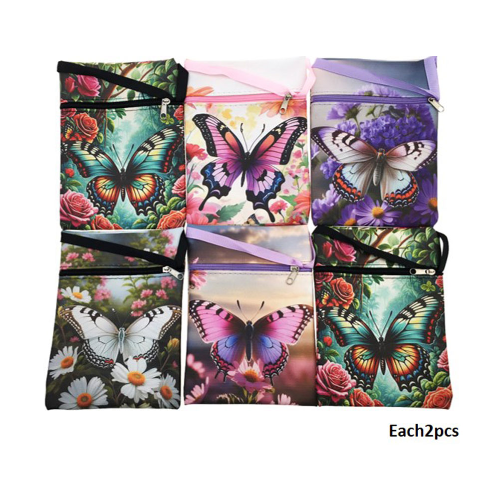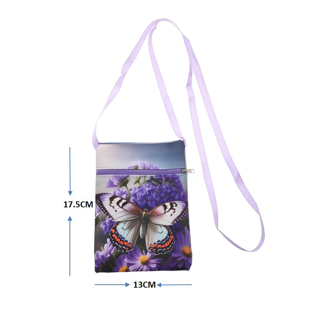 Details • Size : 5" X 6.6" • Strap Size : 42" L • Zipper Closure • Stylish mini crossbody bags with vivid butterfly and floral prints, featuring zippered closure and adjustable straps. Perfect for carrying small essentials. Set includes 12 assorted nature-inspired designs.