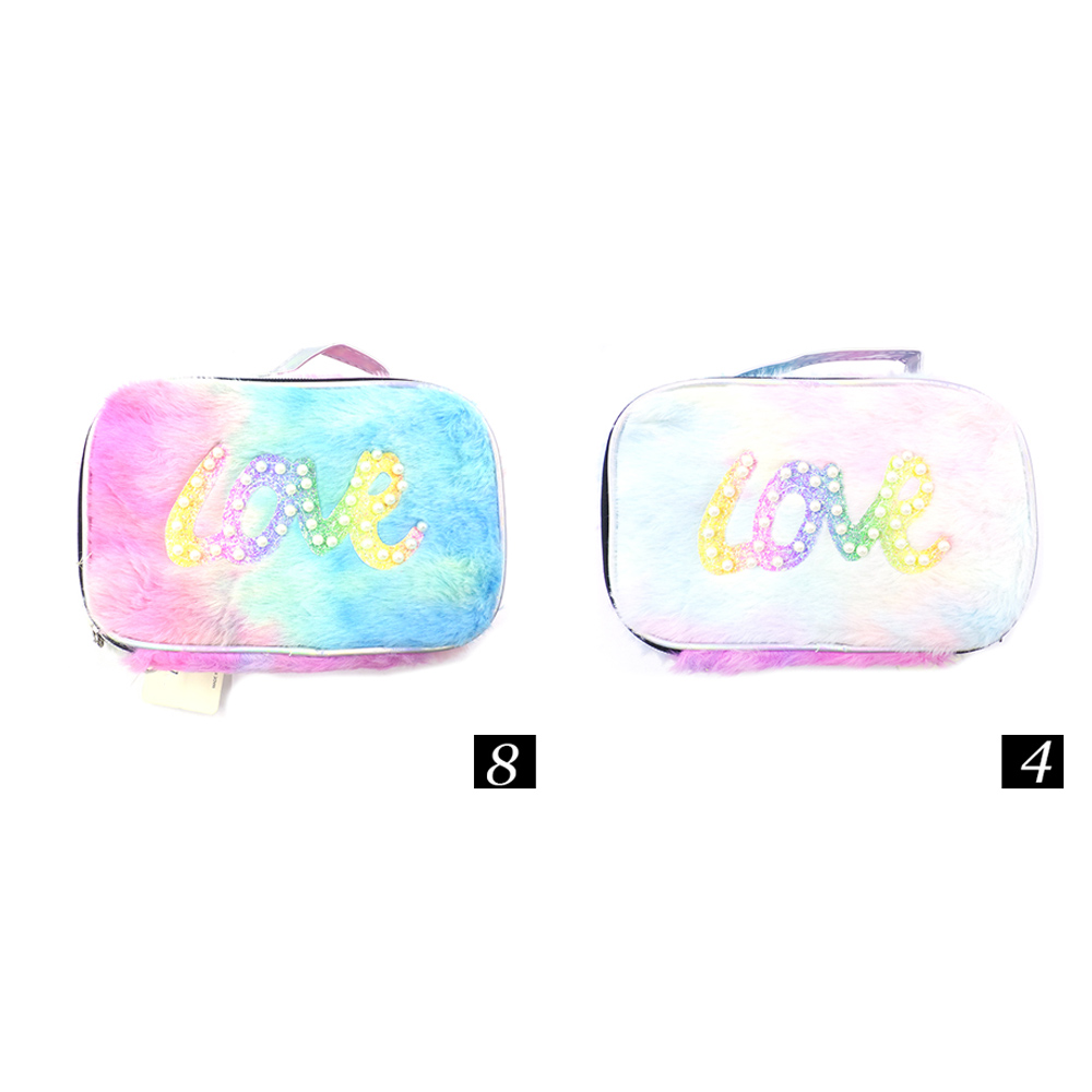 • Soft furry cosmetic bags featuring a pearl-studded "Love" design. Spacious and stylish for makeup, toiletries, or travel essentials. Sold in a set of 12, ideal for gifts or resale.